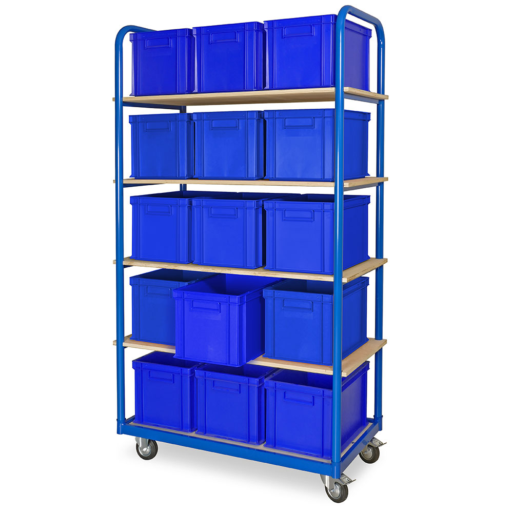 Etagenwagen mit 5 Ebenen, BxTxH 1050x500x1880 mm, 2 Lenk- (mit Feststellbremse) u. 2 Bockrollen, bestückt mit 15 Euroboxen BxTxH 400x300x280 mm, mit Griffleisten