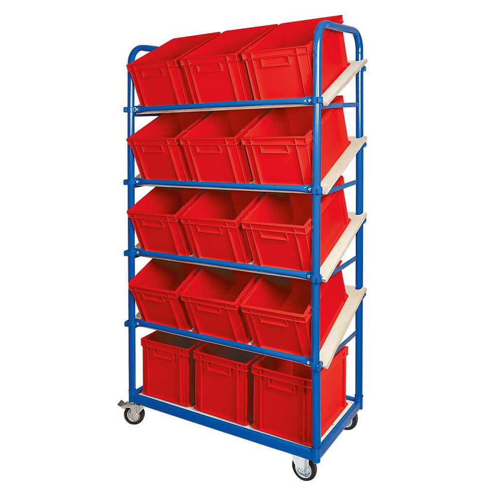 "Schrägboden-Regalwagen mit 5 Ebenen, BxTxH 1050x500x1880 mm, 2 Lenk- (mit Feststellbremse) u. 2 Bockrollen, bestückt mit 15 Euroboxen BxTxH 400x300x235 mm, mit Griffleisten"