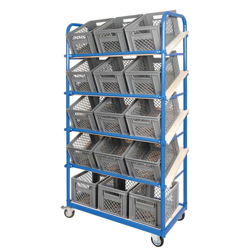 Praktischer Eurokasten-Wagen, bestückt mit 15 Eurobehältern/Stapelkörben mit Durchfassgriffen. Regalrahmen aus Stahlrohrprofil, hochwertig kunststoffbeschichtet in blau. Böden aus 15 mm starken Schichtholzladeflächen, naturbelassen. Ideal für die übersichtliche Lagerung und Bereitstellung von Kleinteilen und Material im Lager oder in der Produktion.