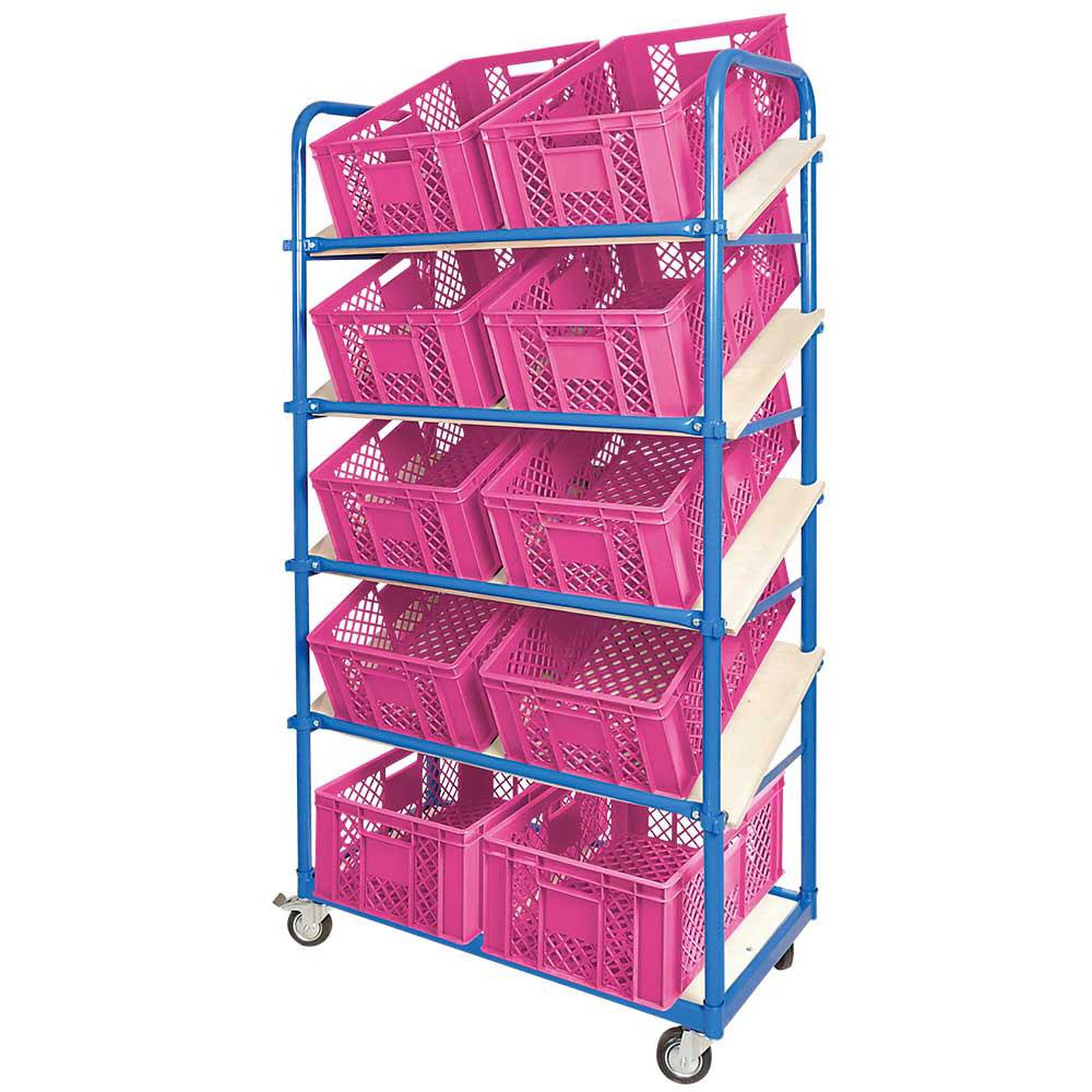 Praktischer Eurokasten-Wagen, bestückt mit 10 Eurobehältern / Stapelkörben mit Durchfassgriffen. Regalrahmen aus Stahlrohrprofil, hochwertig kunststoffbeschichtet in blau. Böden aus 15 mm starken Schichtholzladeflächen, naturbelassen. Ideal für die übersichtliche Lagerung und Bereitstellung von Kleinteilen und Material im Lager oder in der Produktion.