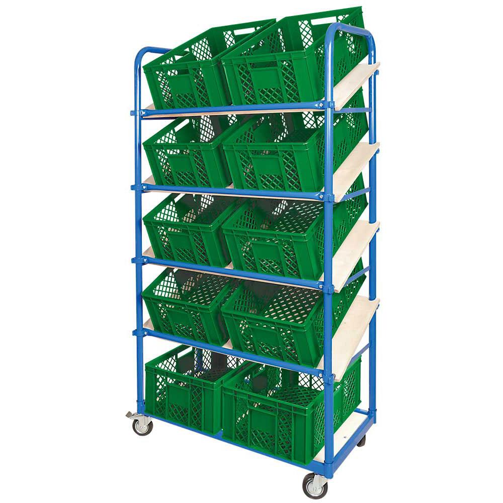 Eurokasten-Wagen, BxTxH 1050x500x1880 mm, 5 Etagen, 4 Schrägböden + 1 waagerechte Ablagefläche. Das fahrbare Schrägbodenregal ist mit 4 Lenkrollen, 2 davon mit Feststellbremse ausgestattet. Oberkante der untersten Ladefläche 165 mm, Tragkraft je Etagenboden 50 kg, Gesamttragkraft des Regals 250 kg.