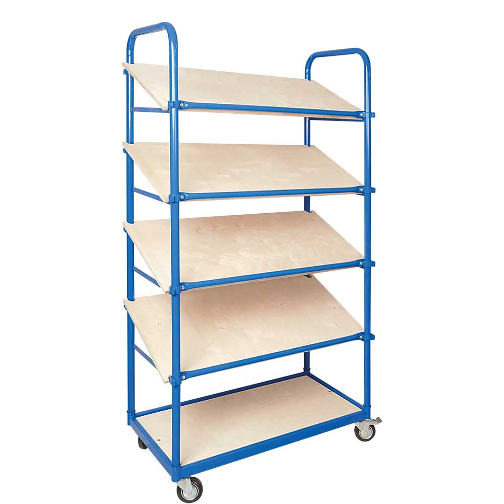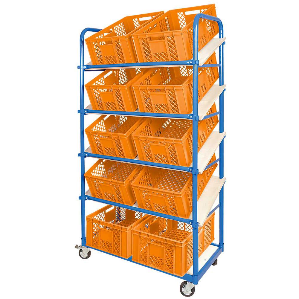 Eurokasten-Wagen, BxTxH 1050x500x1880 mm, 5 Etagen, 4 Schrägböden + 1 waagerechte Ablagefläche. Das fahrbare Schrägbodenregal ist mit 4 Lenkrollen, 2 davon mit Feststellbremse ausgestattet. Oberkante der untersten Ladefläche 165 mm, Tragkraft je Etagenboden 50 kg, Gesamttragkraft des Regals 250 kg.