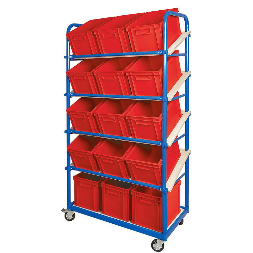 Praktischer Eurokasten-Wagen, bestückt mit 15 Eurobehältern mit Griffleisten. Regalrahmen aus Stahlrohrprofil, hochwertig kunststoffbeschichtet in blau. Böden aus 15 mm starken Schichtholzladeflächen, naturbelassen. Ideal für die übersichtliche Lagerung und Bereitstellung von Kleinteilen und Material im Lager oder in der Produktion.