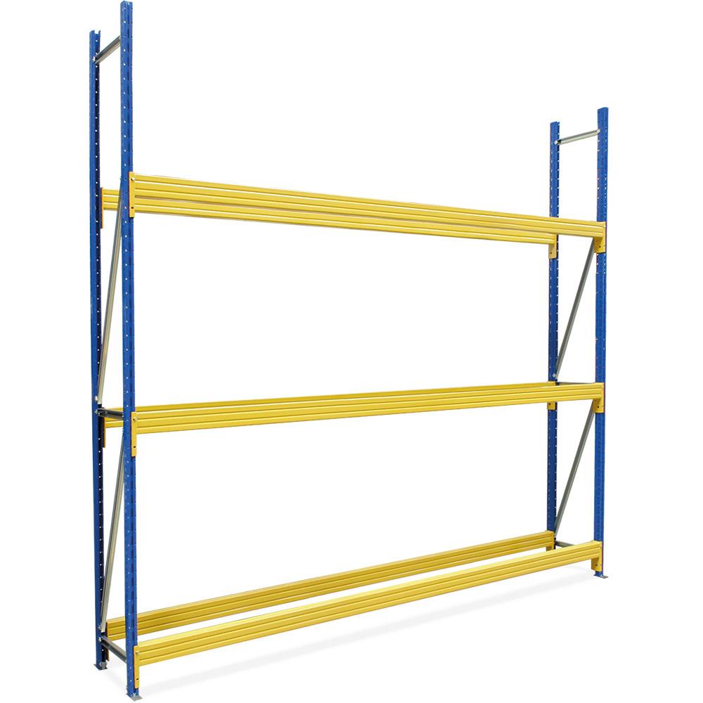 Für eine schonende Lagerung von Pkw-Reifen mit einem Durchmesser von 550-750 mm. Das Regal kann beidseitig bedient werden. Die Stützenprofile sind aus hochfestem Stahl geformt und erhalten durch ihre spezielle Profilierung eine sehr hohe Steifigkeit. Sie werden durch Diagonal- und Horizontalstreben zu einem Fachwerkrahmen verschraubt und werden zerlegt angeliefert, inkl. Fußplatten. Stützprofile RAL 5010 enzianblau, Tragbalken RAL 1004 goldgelb kunststoffbeschichtet.
