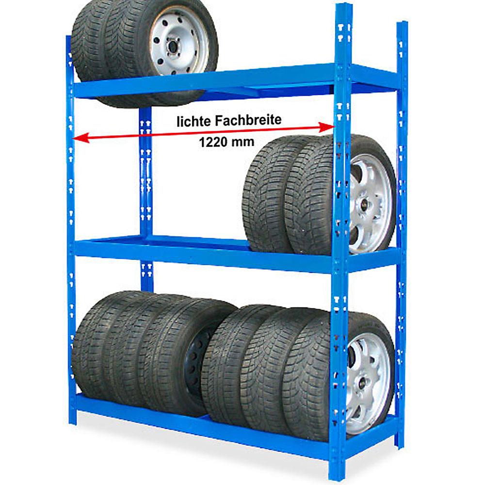 Reifenregal mit 3 Regalebenen, Tragkraft pro Ebene 100 kg. Alle Teile sind hochwertig kunststoffbeschichtet in Farbe blau RAL 5017. Das Reifenregal ist für Reifen bis Ø 680 mm geeignet und ermöglicht eine beidseitige Bestückung und Entnahme. Die Auflagebalken sind gesteckt und im Raster von 90 mm in der Höhe verstellbar. Durch das spezielle Traversenprofil ist eine schonende Lagerung der Reifen möglich.