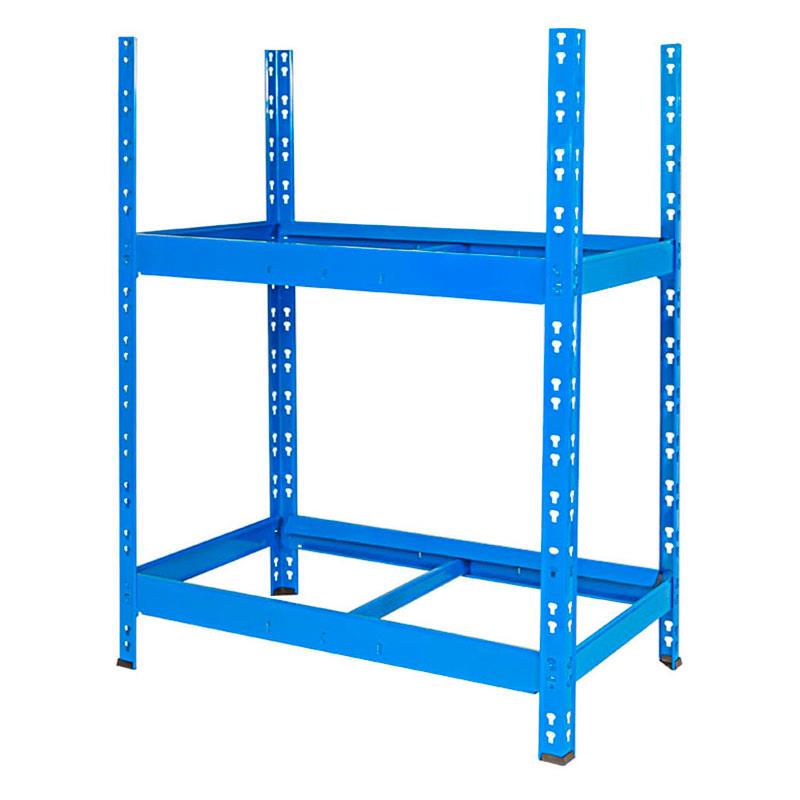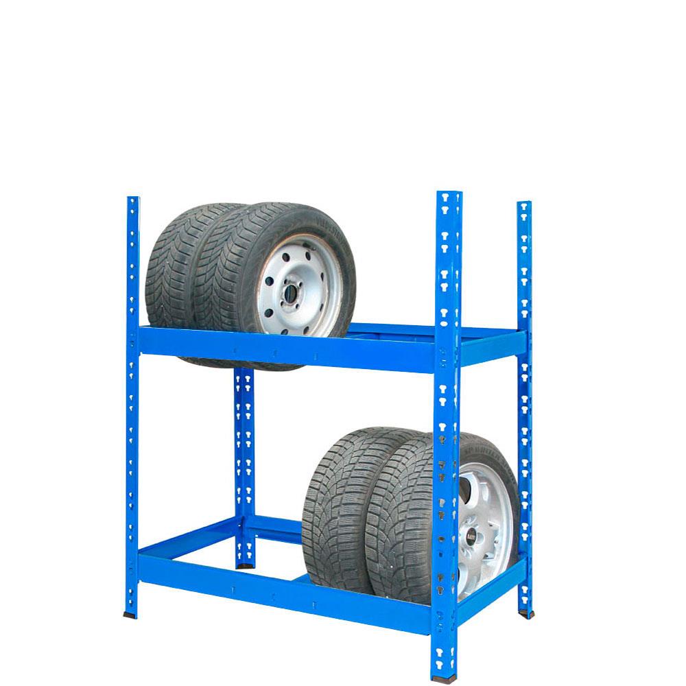 Reifenregal mit 2 Regalebenen, Tragkraft pro Ebene 100 kg. Alle Teile sind hochwertig kunststoffbeschichtet in Farbe blau RAL 5017. Das Reifenregal ist für Reifen bis Ø 680 mm geeignet und ermöglicht eine beidseitige Bestückung und Entnahme. Die Auflagebalken sind gesteckt und im Raster von 90 mm in der Höhe verstellbar. Durch das spezielle Traversenprofil ist eine schonende Lagerung der Reifen möglich.
