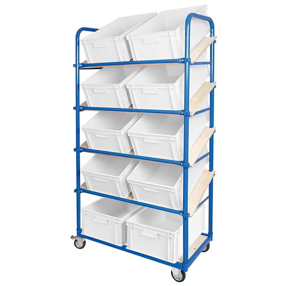 Schrägboden-Regalwagen mit 5 Ebenen, BxTxH 1050x500x1880 mm, 2 Lenk- (mit Feststellbremse) u. 2 Bockrollen, bestückt mit 10 Euroboxen BxTxH 600x400x220 mm, mit Griffleisten