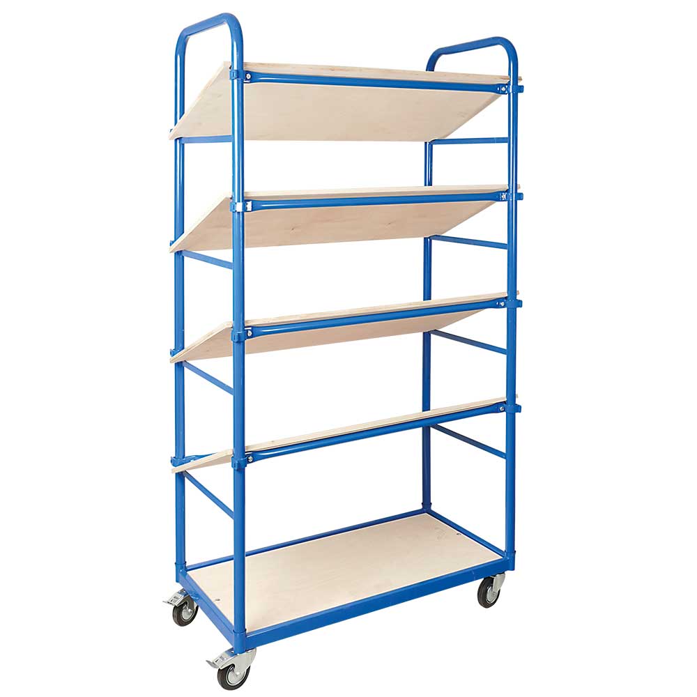 Eurokasten-Wagen, BxTxH 1050x500x1880 mm, 5 Etagen, 4 Schrägböden + 1 waagerechte Ablagefläche. Das fahrbare Schrägbodenregal ist mit 4 Lenkrollen, 2 davon mit Feststellbremse ausgestattet. Oberkante der untersten Ladefläche 165 mm, Tragkraft je Etagenboden 50 kg, Gesamttragkraft des Regals 250 kg.