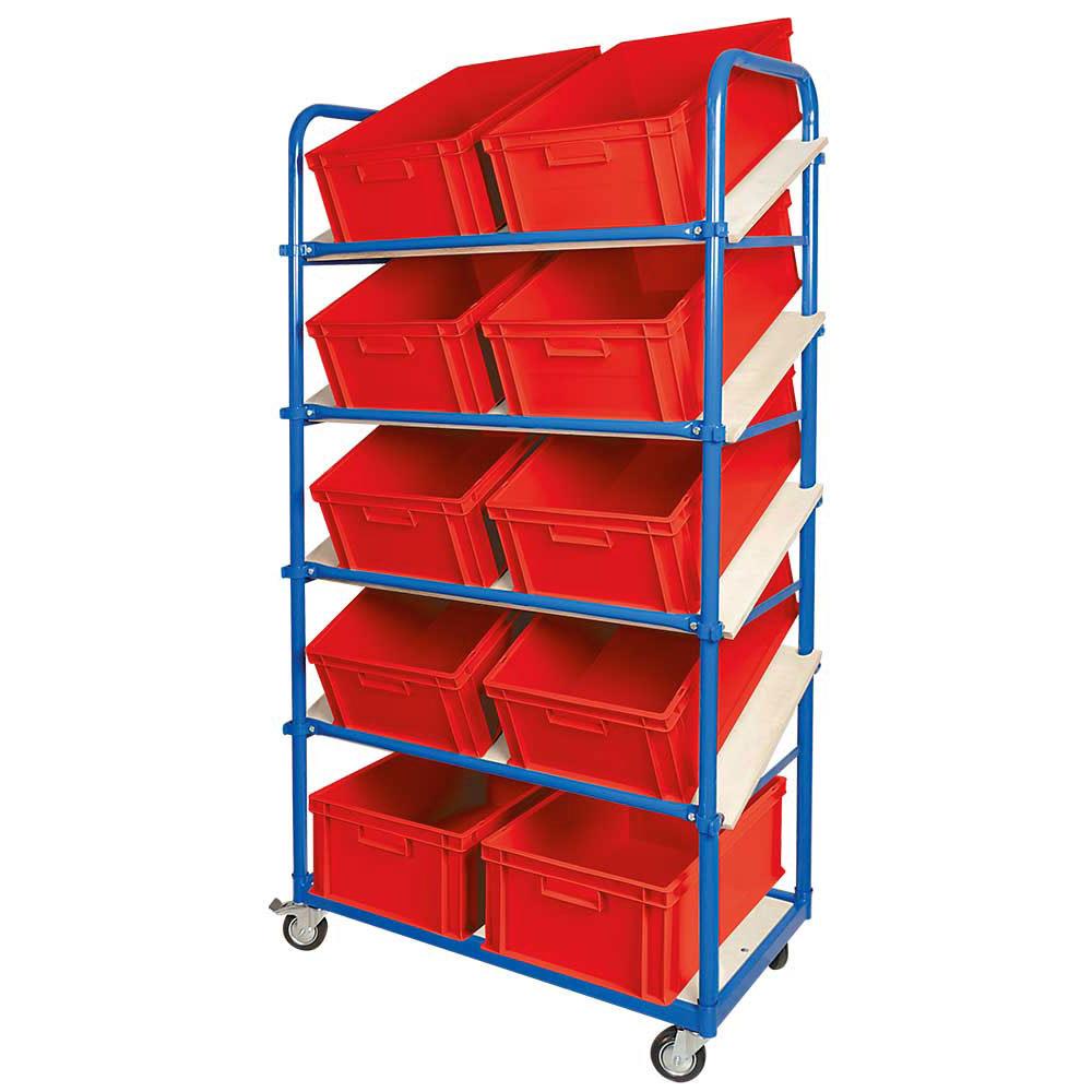 "Schrägboden-Regalwagen mit 5 Ebenen, BxTxH 1050x500x1880 mm, 4 Lenkrollen, 2 Rollen mit Feststellbremse, bestückt mit 10 Euroboxen BxTxH 600x400x220 mm, mit Griffleisten"