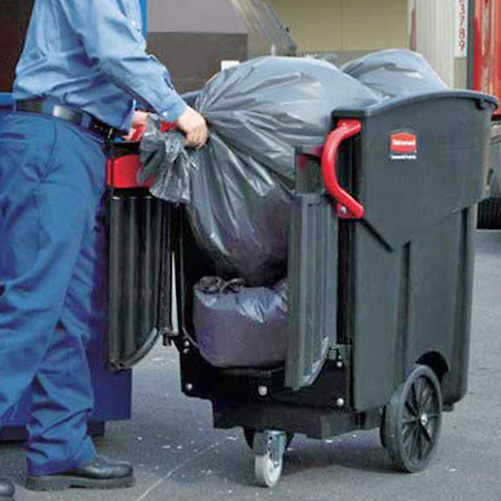 Abfallwagen mit schlanker Form und roten Schiebebügeln, dreht sich um die eigene Achse und... mehr