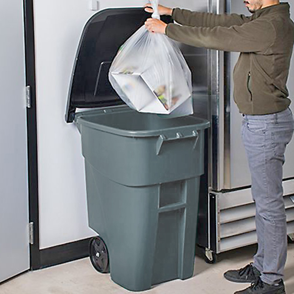 Rollcontainer für Abfallsammlung und Materialtransport. Leicht beweglich auf Schwerlasträder mit einem Ø von 203 mm, auch über Stufen. Der fest angebrachte Scharnierdeckel schließt dicht, schwingt nach hinten und rastet ein. Eingearbeitetes Achsengehäuse für zusätzliche Verstärkung. Für die Nutzung im Innen- und Außenbereich geeignet. Mit UV-Stabilisator für erhöhte Haltbarkeit bei Verwendung im Außenbereich.