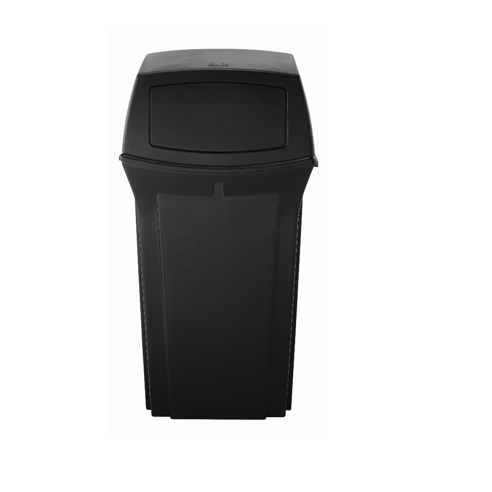 Abfallbehälter "Ranger" von Rubbermaid mit moderner Aufmachung und einfacher Bedienung. Großes Fassungsvermögen und fest angebrachter Klappdeckel für einfaches Entleeren. Die Metallhalterung gewährleistet eine sichere Halterung der Abfallsäcke, das Binden von Knoten erübrigt sich. Eigens entwickelt für Stadien, Parks, Einkaufszentren und sonstige, stark frequentierte Bereiche. Der Abfallbehälter ist kältebeständig bis -17°C, hitzebeständig bis + 44°C. Entspricht den FM-Vorschriften zur Gewährleistung der Brandsicherheit.