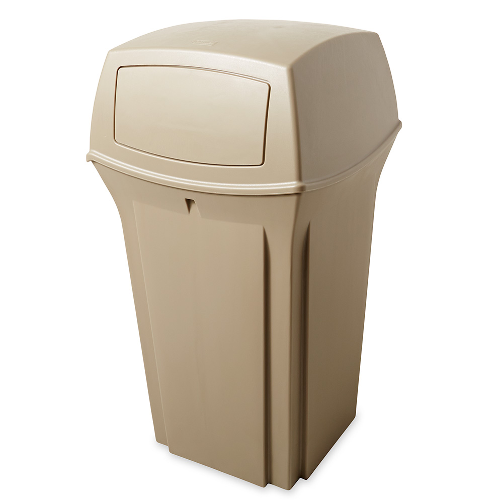 Abfallbehälter "Ranger" von Rubbermaid mit moderner Aufmachung und einfacher Bedienung. Großes Fassungsvermögen und fest angebrachter Klappdeckel für einfaches Entleeren. Die Metallhalterung gewährleistet eine sichere Halterung der Abfallsäcke, das Binden von Knoten erübrigt sich. Eigens entwickelt für Stadien, Parks, Einkaufszentren und sonstige, stark frequentierte Bereiche. Der Abfallbehälter ist kältebeständig bis -17°C, hitzebeständig bis + 44°C. Entspricht den FM-Vorschriften zur Gewährleistung der Brandsicherheit.