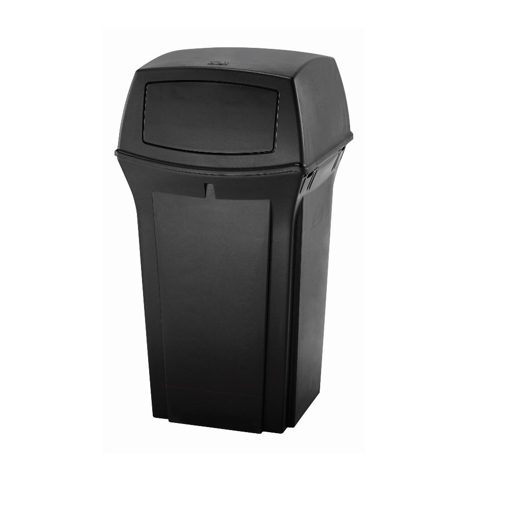 Abfallbehälter "Ranger" von Rubbermaid mit moderner Aufmachung und einfacher Bedienung. Großes Fassungsvermögen und fest angebrachter Klappdeckel für einfaches Entleeren. Die Metallhalterung gewährleistet eine sichere Halterung der Abfallsäcke, das Binden von Knoten erübrigt sich. Eigens entwickelt für Stadien, Parks, Einkaufszentren und sonstige, stark frequentierte Bereiche. Der Abfallbehälter ist kältebeständig bis -17°C, hitzebeständig bis + 44°C. Entspricht den FM-Vorschriften zur Gewährleistung der Brandsicherheit.
