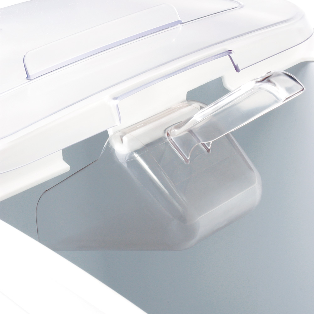 Dreischichtige, dicke Wände für hohe Stabilität. Material Polypropylen-Kunststoff (PP). Abnehmbarer Stülpdeckel, 2-teilig. Hinterer Deckelteil aus weißem Polypropylen-Kunststoff(PP). Vorderer Teil zum Aufschieben und Aufklappen, aus glasklarem Polycarbonat-Kunststoff (PC). Abgeschrägte, ergonomische Form für leichten Zugang, selbst bei ungünstigem Standort, z. B. unter einem Arbeitstisch. Der Deckel mit Schnappverschluß schließt den Behälter dicht ab und gewährleistet höchste Sicherheit und Sauberkeit. Der Klarsichtdeckel ermöglicht ein problemloses Erkennen des Behälterinhaltes. Nahtlose, glatte Bauweise und abgerundete Ecken für leichte Innen- und Außenreinigung. Leicht im Gewicht, leicht zu transportieren.