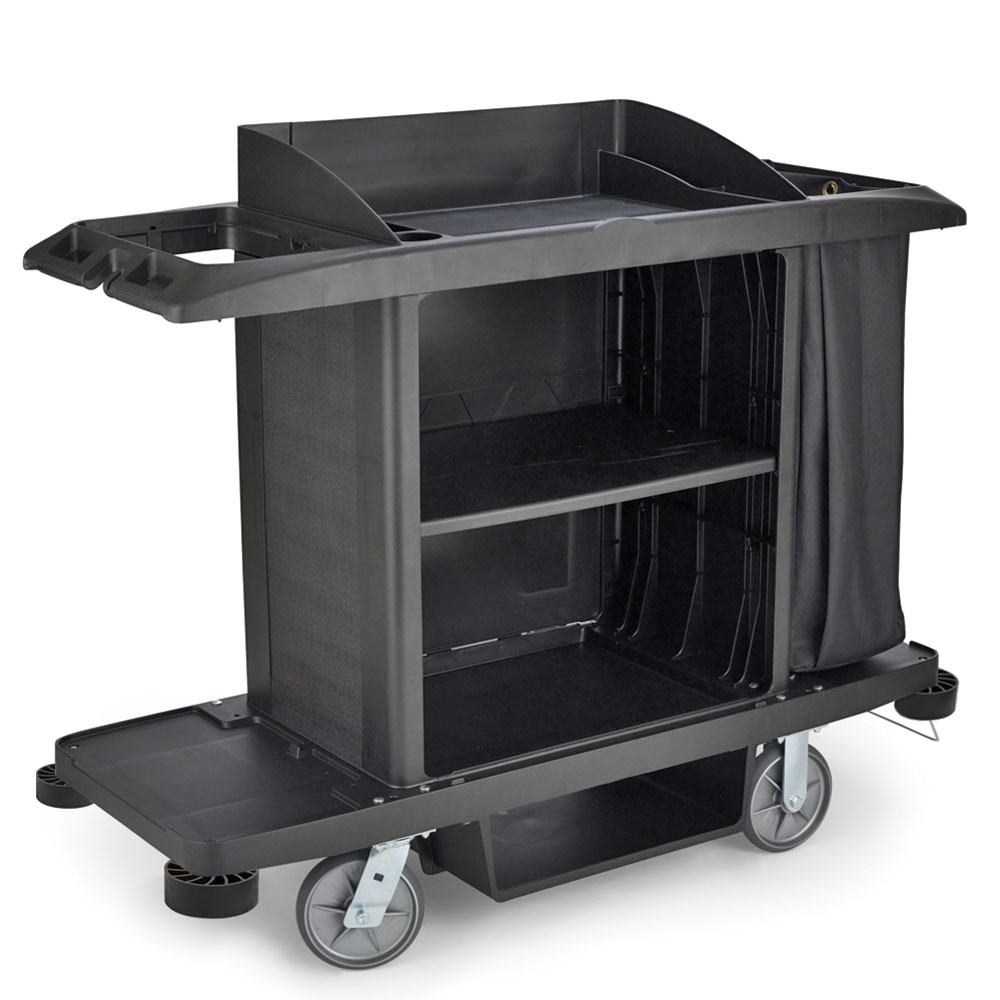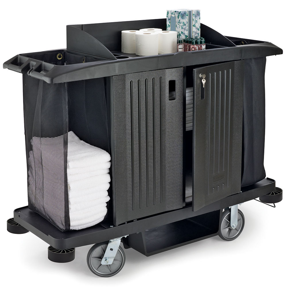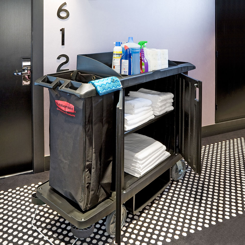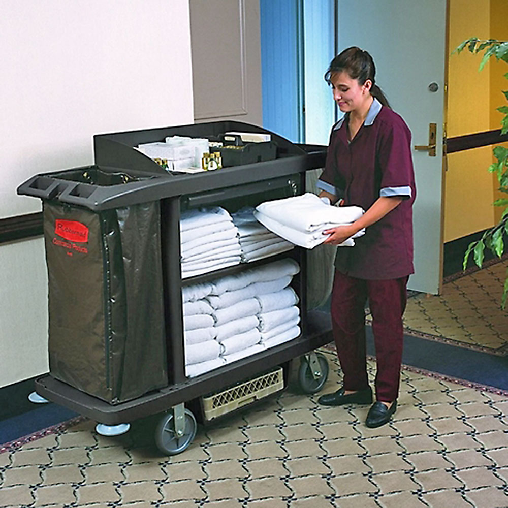 Der Rubbermaid Hotelwagen verfügt über ein großes Fassungsvermögen und ist entwickelt für große Hotels. Bei voller Ausstattung ist der Wagen für bis zu 16 Hotelzimmer ausreichend. Der Hotel- und Reinigungswagen ist sowohl leicht als auch vielseitig und äußerst manövrierfähig, was die Produktivität des Hotelpersonals steigert und gleichzeitig die Belastung und das Verletzungsrisiko reduziert. Der Wagen ist wasser- und chemikalienbeständig und verfügt über eine glatte, leicht zu reinigende Oberfläche. Eingearbeitete Griffe sorgen für eine optimale Mobilität in Kurven und Gängen. Leise und abdruckfreie Gummiräder mit einem durchmesser von 200 mm und zwei Feststellbremsen Unterstützen die Manivrierfähigkeit zudem.