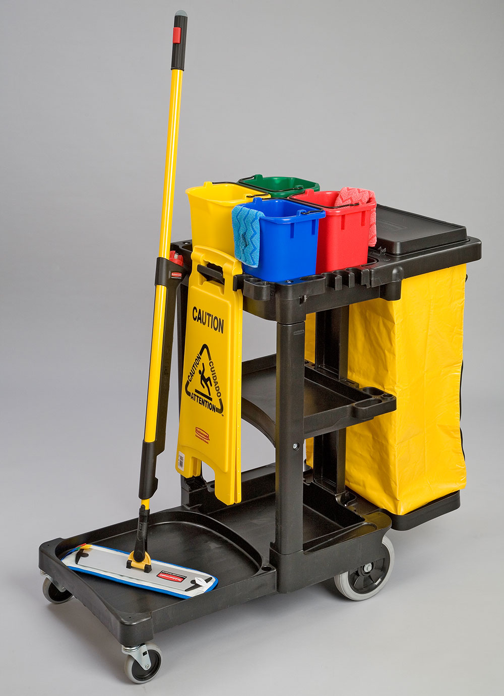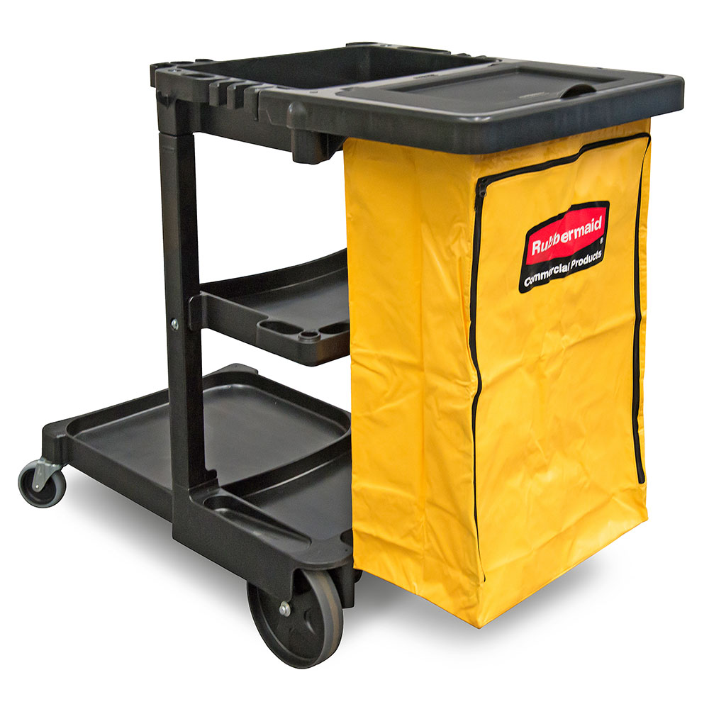 Der Hausmeister- Reinigungswagen von Rubbermaid verfügt über eine glatte, leicht zu reinigende Oberfläche. Der im Lieferumfang enthaltene Vinylsack mit wasserfester PVC-Beschichtung fasst bis zu 92 Liter und verfügt über einen Reißverschluss an der Vorderseite zur leichteren Abfallentsorgung. Der Hausmeisterwagen ist auf 2 Lauf- und 2 Lenkrollen  leicht und abdruckfrei manövrierbar. Zudem bietet der Reinigungswagen einen Abfalldeckel mit Staufach, Halterungen für Stiele unterschiedlicher Größe, 2 Haken, einen Müllschaufelhalter und eine Plattform für einen Doppeleimer von Rubbermaid.