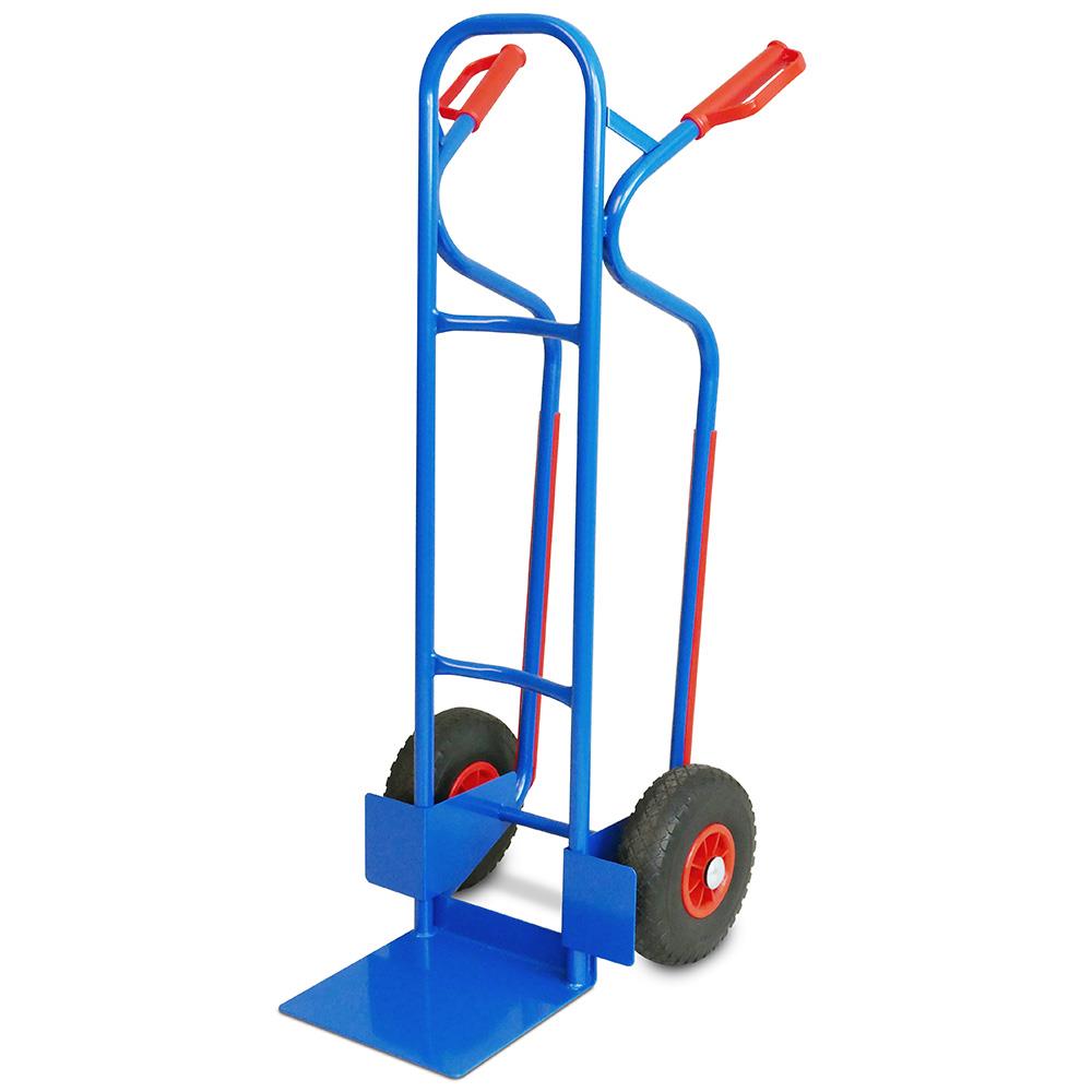 Schonen Sie Ihren Rücken und ersparen Sie sich schweres Tragen. Ideal zum Transportieren von großen und unhandlichen Gegenständen. 2 Sicherheitsgriffe mit Handschutzbügeln und 2 Treppenrutschkufen aus hochfestem Kunststoff. Geschweißte Stahlrohr-Konstruktion mit Radschutz, in Farbe blau RAL 5010 schlag- und kratzfest kunststoffbeschichtet. Pannensichere Reifen mit griffigem Stollenprofil, Ø 260x80 mm.