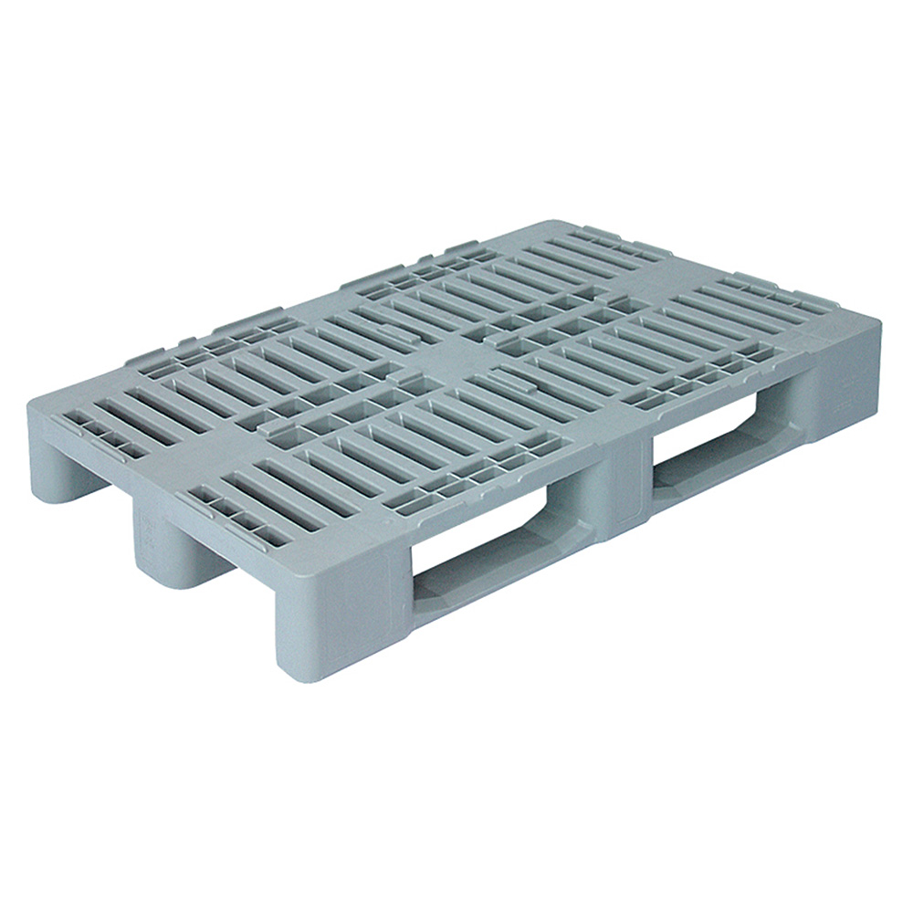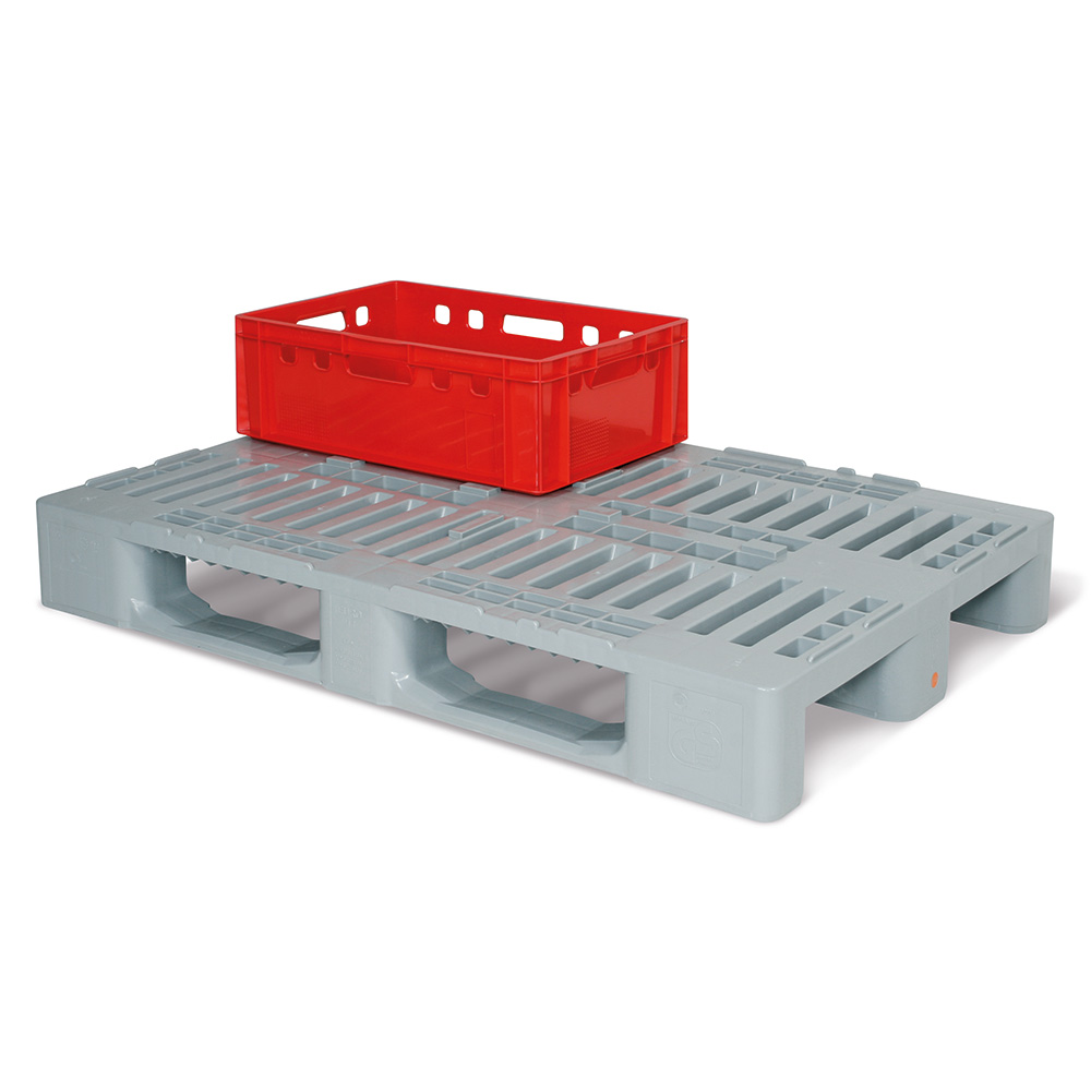 Material PE-HD. Geeignet für Lebensmittel. LxBxH 1200x800x160 mm. Oberfläche durchbrochen. Mit 3 Kufen, Sicherungsrand und Mittelarretierung. Farbe grau. Gewicht 18 kg. Aus PE-HD. Tragkraft dynamisch 1250 kg, statisch 5000 kg, im Hochregal 1000 kg.