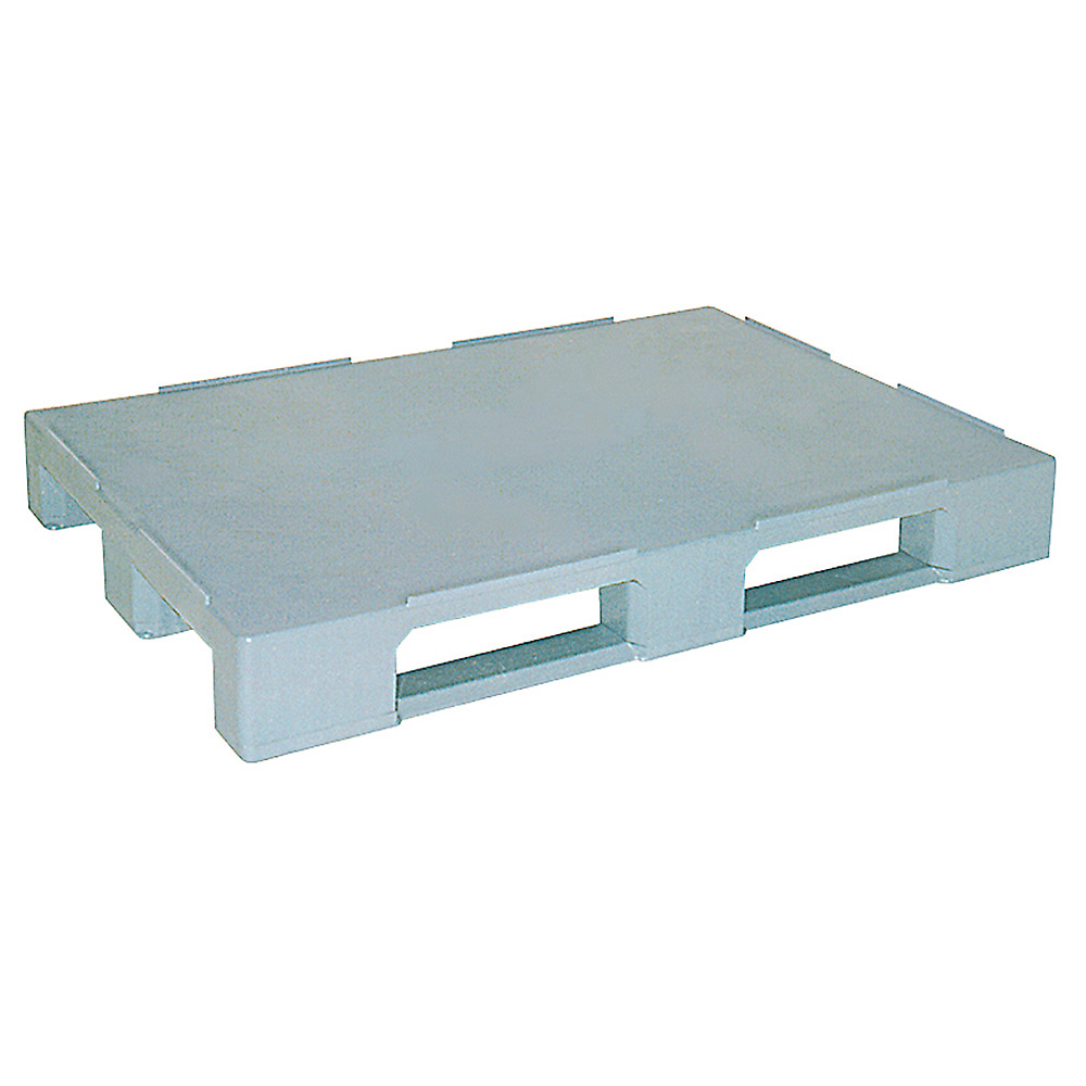 Kufenpalette aus 100% Polyethylen-Kunststoff (PE-HD). Oberfläche geschlossen. Mit Sicherungsrand und 3 Kufen. Farbe grau. Tragkraft dynamisch 1500 kg. Tragkraft statisch 5000 kg. LxBxH 1200x800x150 mm.