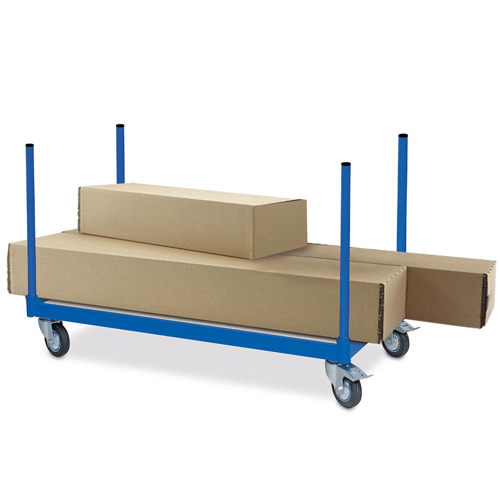 Praktischer und preiswerter Rungenwagen für viele Einsatzzwecke - mit eingesteckten Halterohren. Geschweißte Stahlrohr- und Profilstahlkonstruktion mit 4 Rungen. In Farbe blau RAL 5010 kunststoffbeschichtet. Robuste 15 mm starke Schichtholzladefläche, naturbelassen. Leicht fahrbar auf 4 Lenkrollen, davon 2 mit Feststellbremse. Leise laufende Gummiräder, ØxB 100x30 mm. Radgehäuse aus verzinktem Stahlblech.
