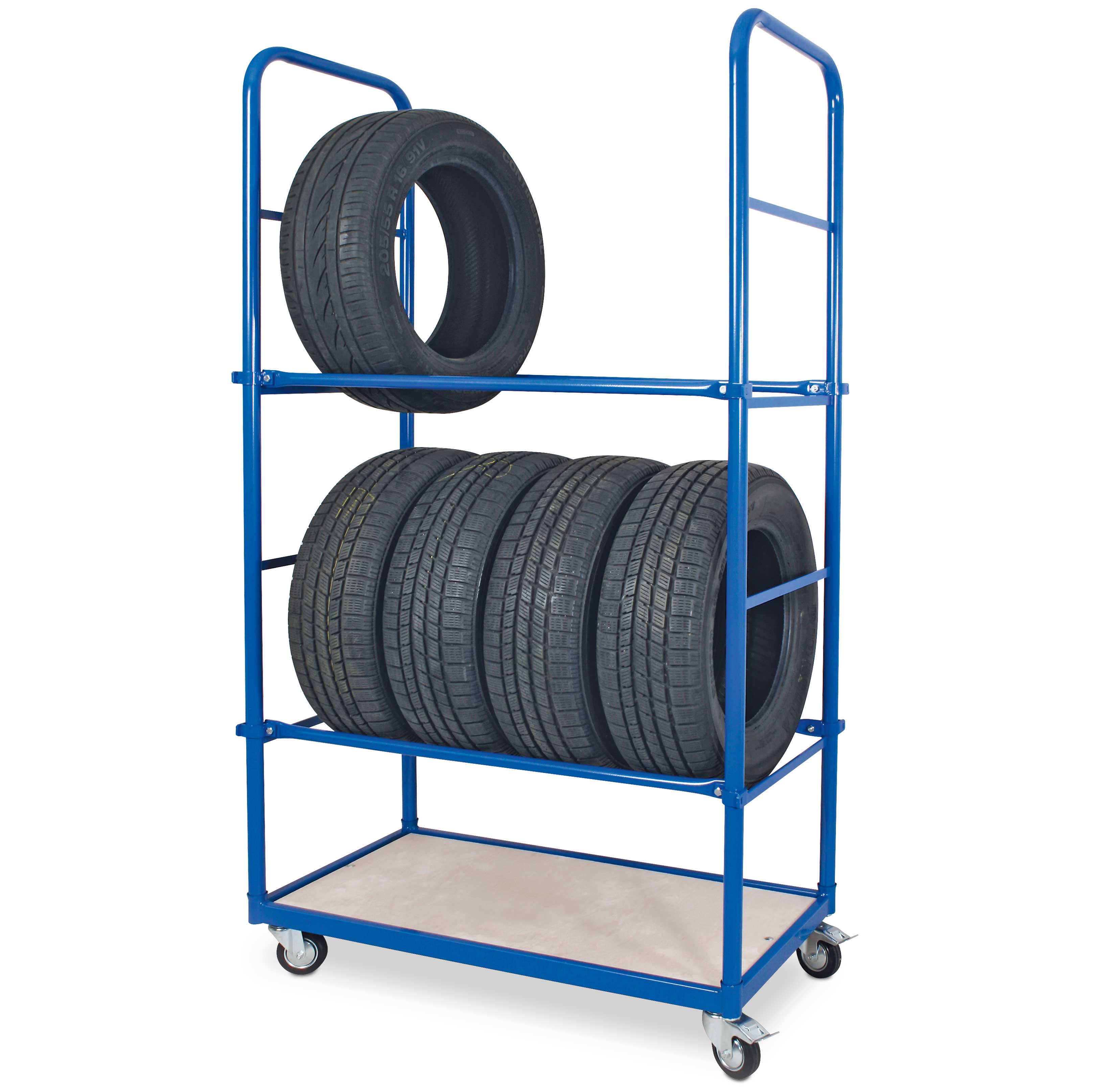 Praktischer Reifen-Transportwagen für die Garage und Werkstatt. Der Reifenwagen besteht aus einer hochwertig geschweißten Stahlrohr- und Profilstahlkonstruktion und ist in der Farbe blau RAL 5010 kunststoffbeschichtet. Die naturbelasse Bodenplatte aus 15 mm starkem Schichtholz ist ideal als Ablagefläche für Werkzeug und Zubehör. 4 Leise laufende Gummi-Lenkräder Ø 100x30 mm mit einem Radgehäuse aus verzinktem Stahlblech ermöglichen eine einfache Manövrierbarkeit.