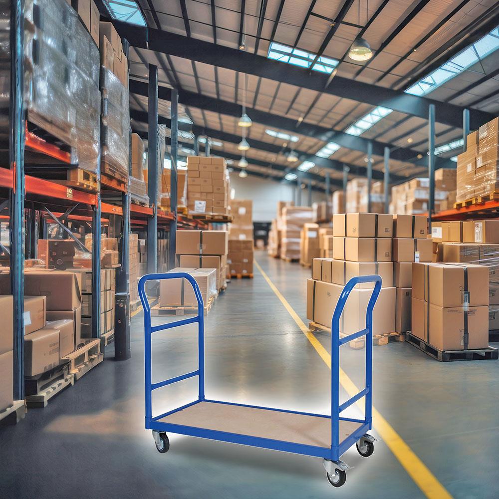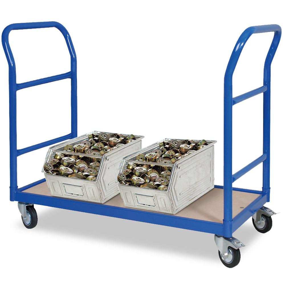 Praktischer Plattformwagen mit 2 eingesteckten Schiebebügel, ideal für viele Einsatzzwecke in Betrieb, Lager und Kommissionierbereich. Geschweißte Stahlrohr- und Profilstahlkonstruktion in Farbe blau RAL 5010 kunststoffbeschichtet. Robuste 15 mm starke Schichtholzladeflächen, naturbelassen. Leicht fahrbar auf 4 Lenkrollen, davon 2 mit Feststellbremse. Leise laufende Gummiräder Ø 100x30 mm, Radgehäuse aus verzinktem Stahlblech.