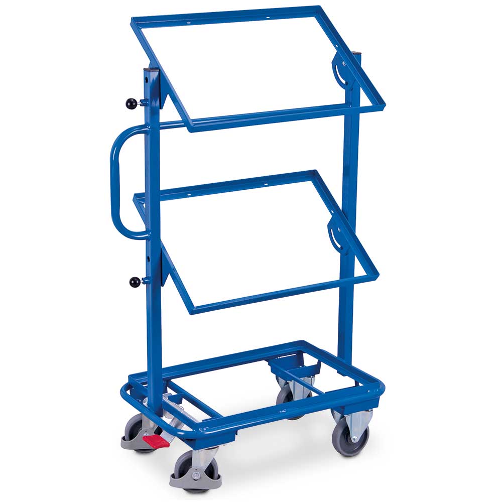 Der Beistellwagen hat 3 Etagen für Behälter, Euro-Boxen, Körbe und Kisten im Euro-Format 600x400 mm. Alle Etagen sind mit einem umlaufenden Rand als Abrutschsicherung versehen und sind um 15° und 30° neigbar. 2 Lenk- und 2 Bockrollen, mit leise laufenden, hellgrauen Gummirädern gewährleisten ein einfaches Handling und spurlosen Lauf. Jede Rolle ist mit einer Kunststofffelge mit Präzisions-Rillenkugellager ausgestattet. Die Lenkrollen haben zusätzlich einen Fußschutz und eine Feststellbremse, die durch Betätigen des Bremspedals gleichzeitig beide Lenkrollen bremst.