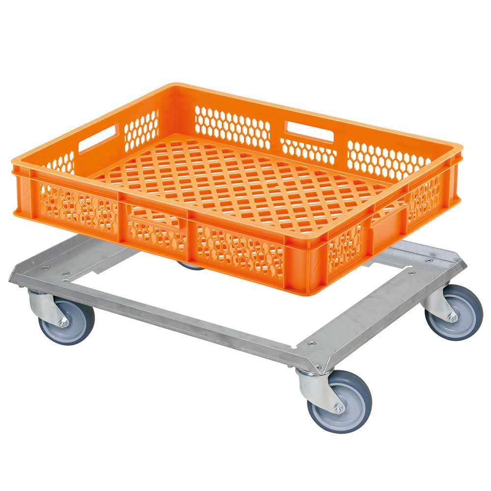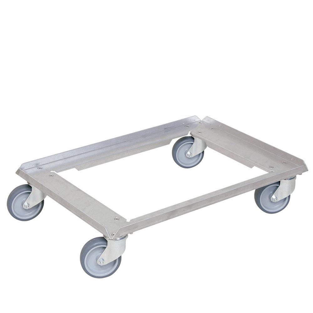 "Alu-Transportroller für Kuchenblechkästen 660x460 und 655x450 mm, 100 mm Gummi-Rad, Deck offen, Tragkraft 250 kg"