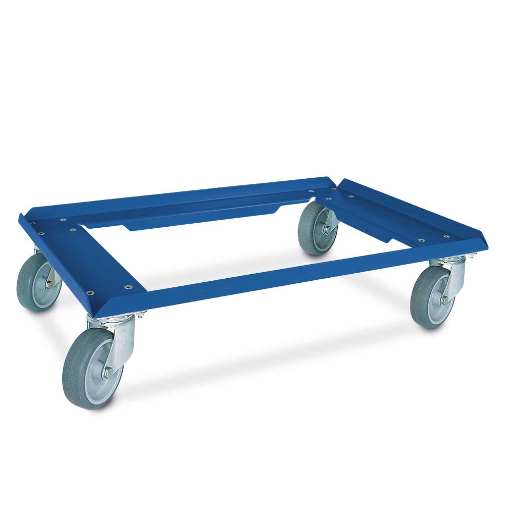 Alu-Transportroller für Eurobehälter 600x400 mm, kunststoffbeschichtet blau, 100 mm Gummi-Rad, Deck offen, Tragkraft 250 kg