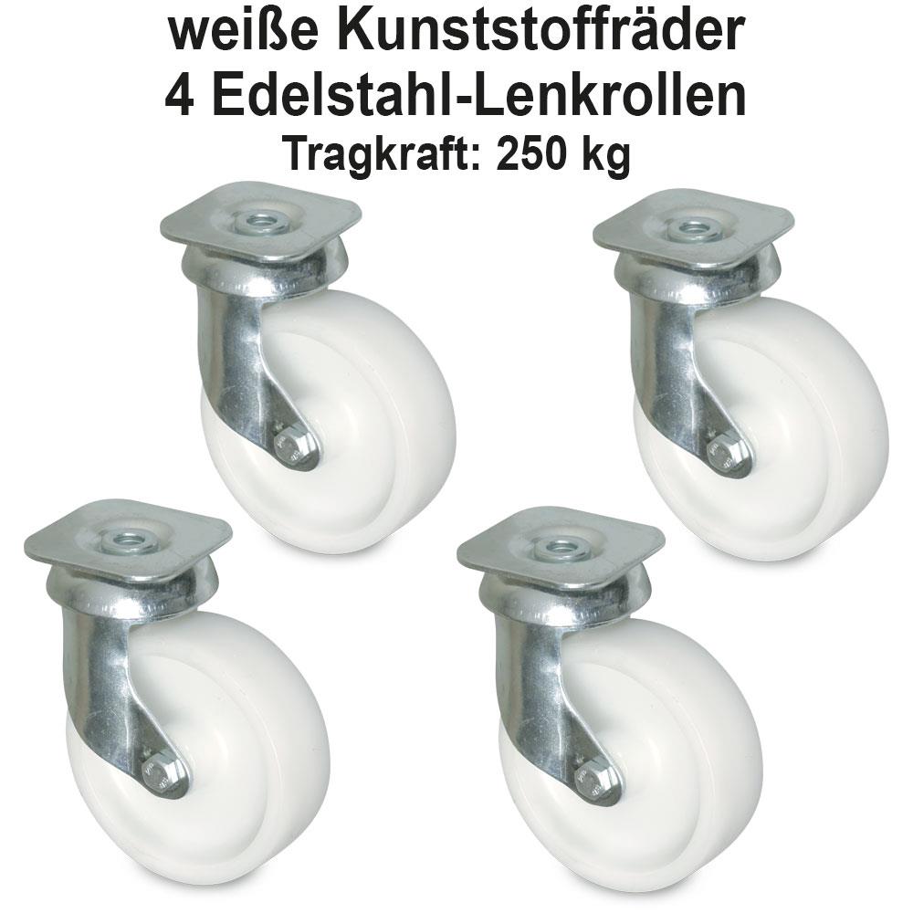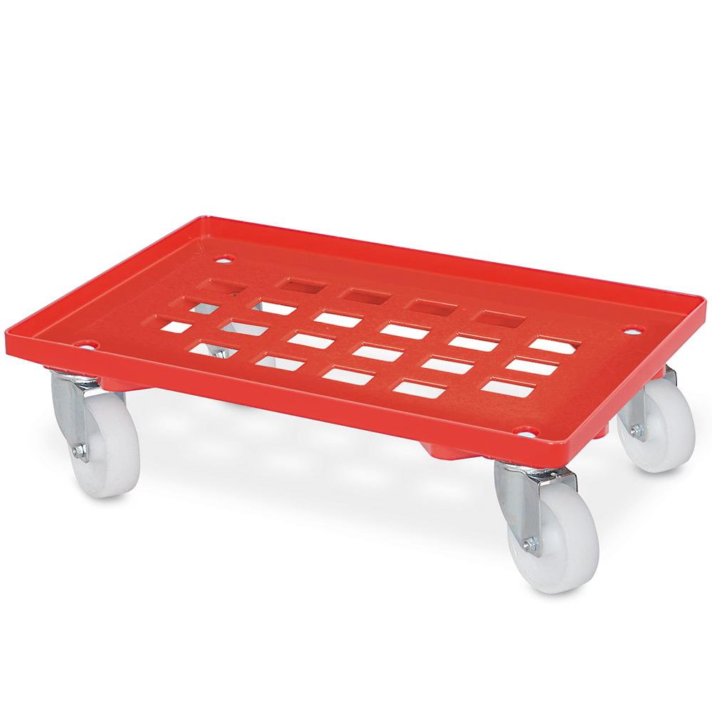 ABS-Kunststoff-Transportroller für 600x400 mm Eurobehälter, Edelstahl Lenkrollen, 100 mm Kunststoff-Rad in weiß, Gitterdeck rot, Tragkraft 250 kg