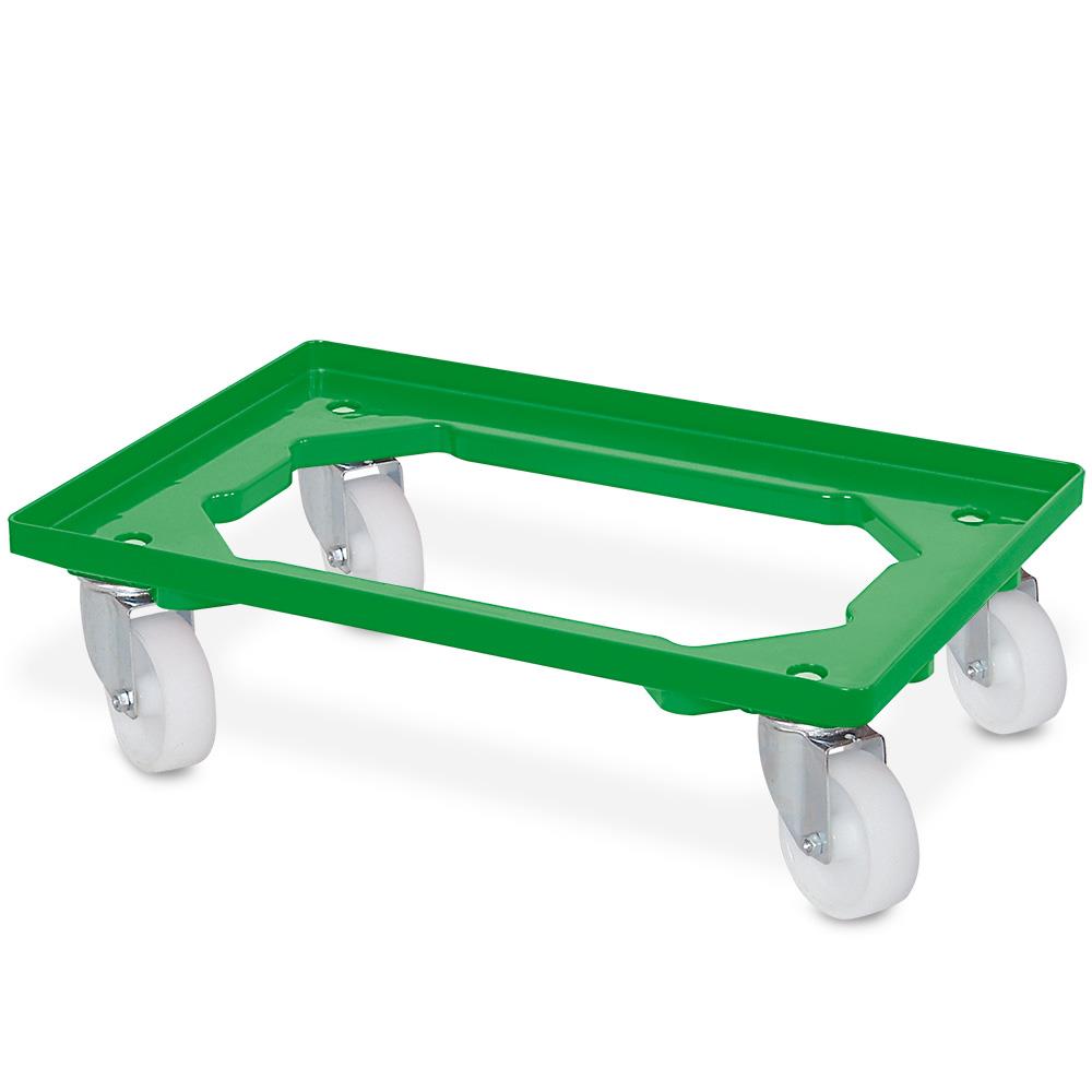 "ABS-Kunststoff-Transportroller für 600x400 mm Eurobehälter, grün, 100 mm Kunststoff-Rad in weiß, Deck offen, Tragkraft 250 kg"