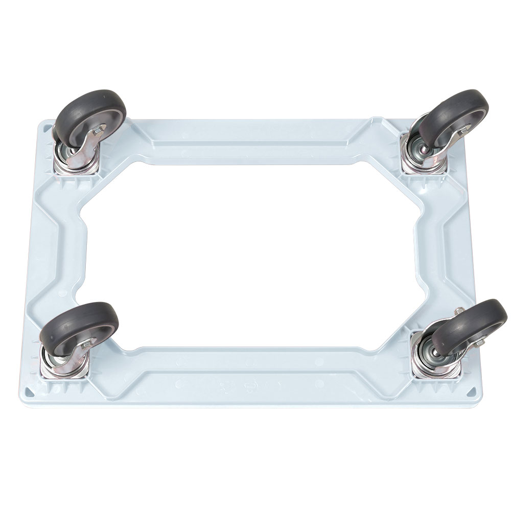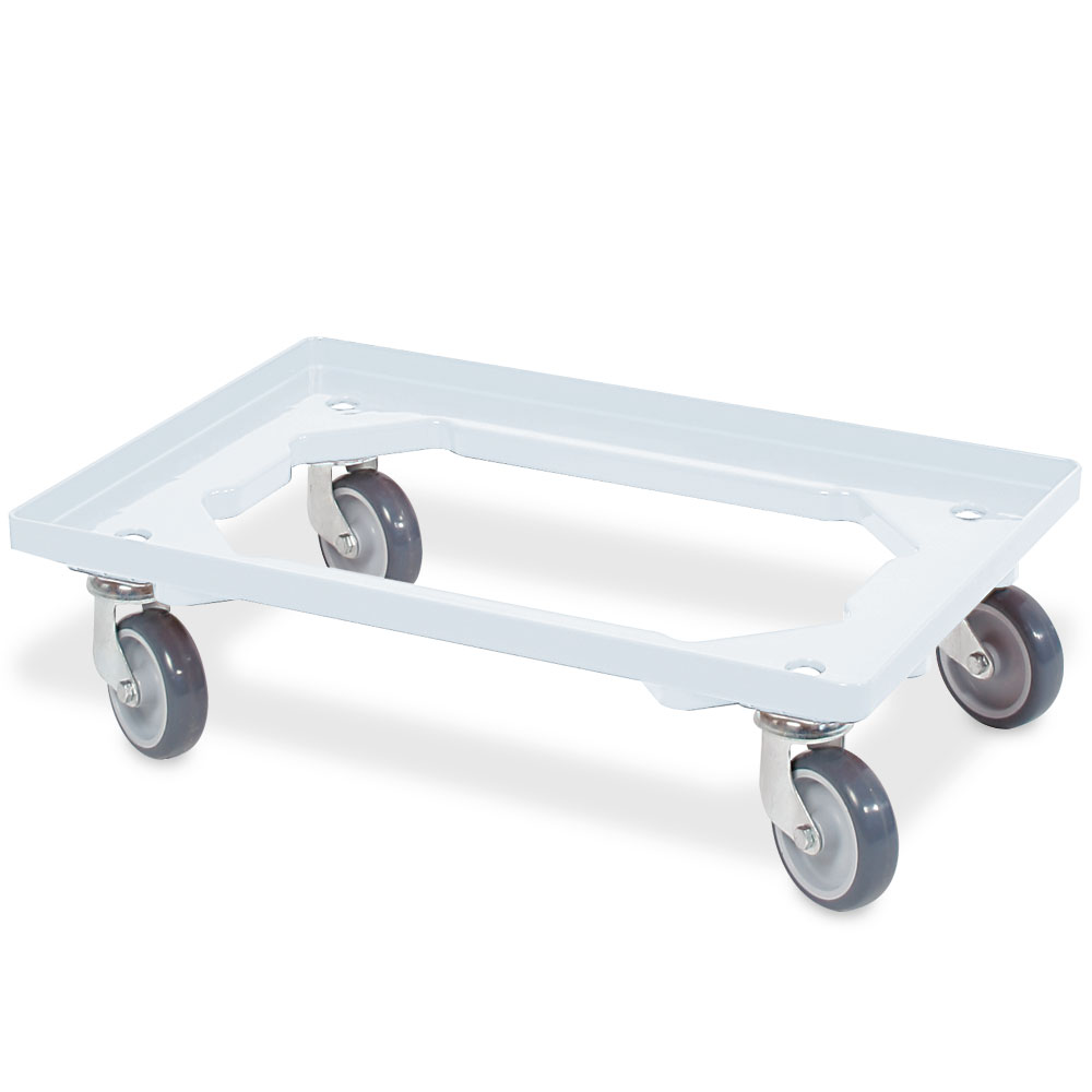 "ABS-Kunststoff-Transportroller für 600x400 mm Eurobehälter, weiß, 100 mm Gummi-Rad, Deck offen, Tragkraft 250 kg"
