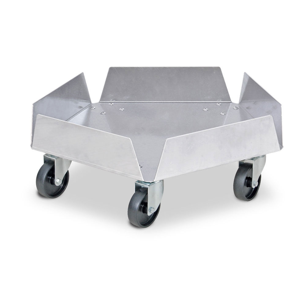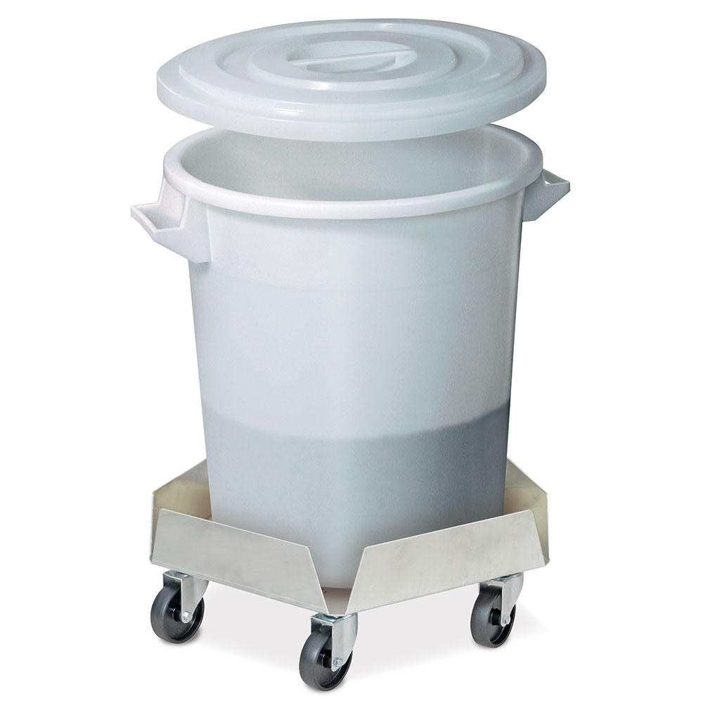 Tonnenroller für runde Tonnen bis 100 Liter. Mit seitlichem Rand für festen Halt der Tonne. 5 Lenkrollen Ø 75 mm für sicheres Fahren. Tonnenroller aus Aluminium. Radgabeln Edelstahl.
