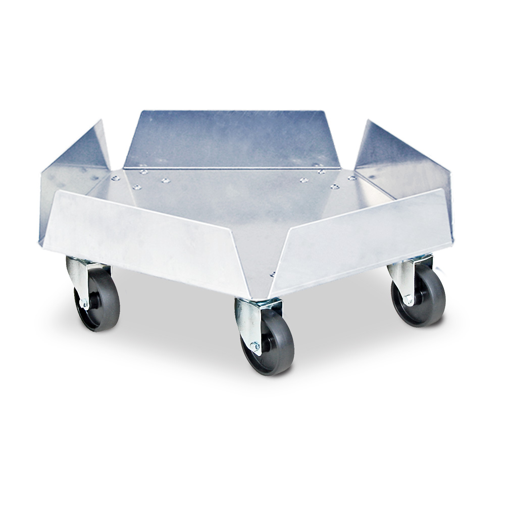 Edelstahl-Tonnenroller mit verzinkten Lenkrollen, und 5 schwarzen Kunststoffrädern Ø 75 mm, Tragkraft 250 kg.