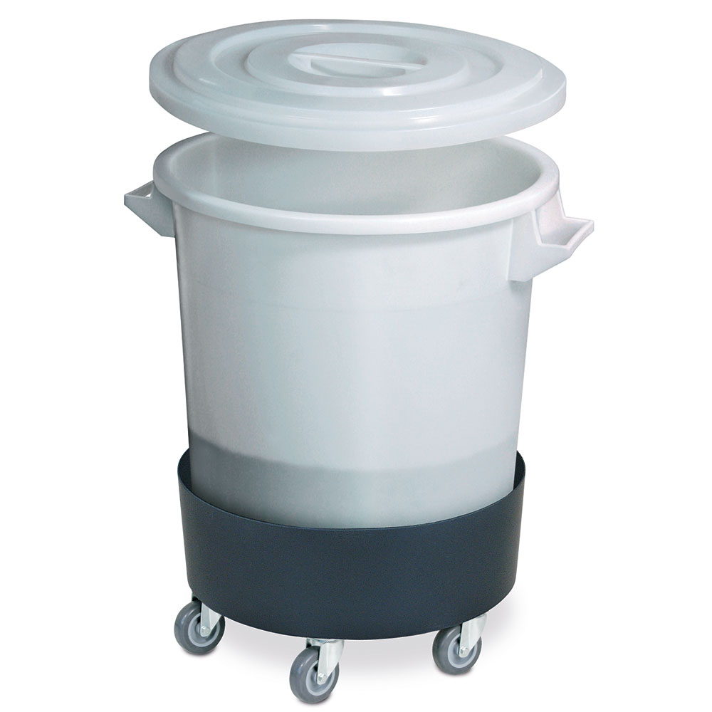 "ABS-Kunststoff-Tonnenroller mit 5 Räder Ø 75 mm, graue Polyurethanlauffläche, verzinkte Lenkrollen, Tragkraft 100 kg"