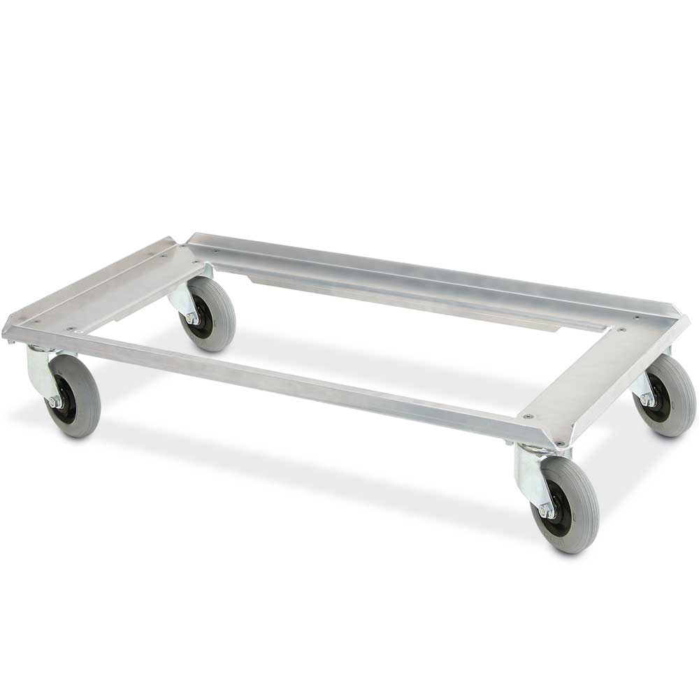Alu-Flüster-Roller für Stapelbehälter 800x400 mm, 100 mm PU-Rad, Deck offen, Tragkraft 250 kg
