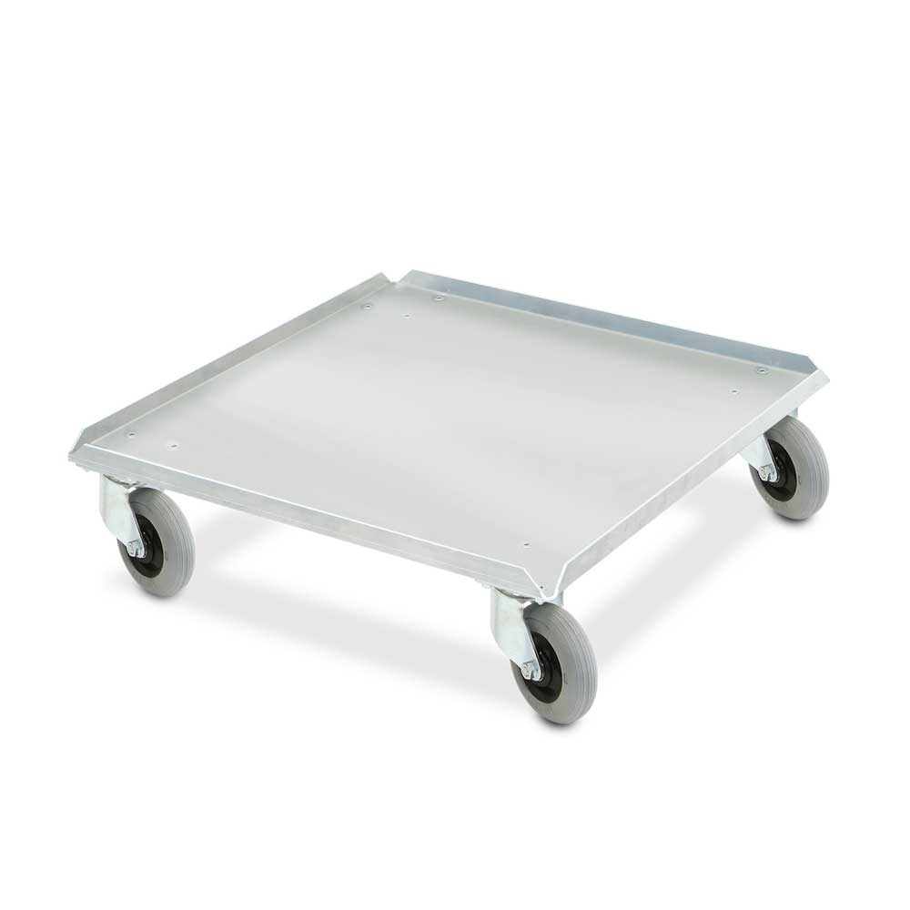 Edelstahl-Flüster-Roller für Spülkörbe 500x500 mm, 100 mm PU-Rad, Deck geschlossen, Tragkraft 250 kg