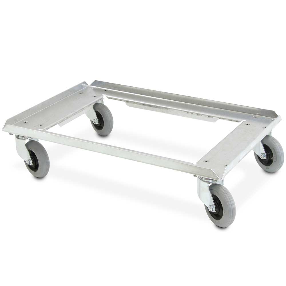 Edelstahl-Flüster-Roller für Stapelbehälter 600x400 mm, 100 mm PU-Rad, Deck offen, Tragkraft 250 kg