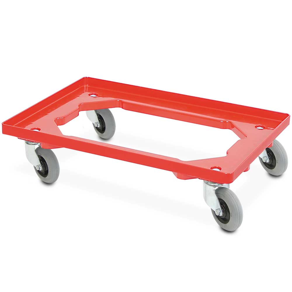 "ABS-Kunststoff-Flüster-Roller für Euro-Stapelbehälter 600x400 mm, rot, 100 mm PU-Rad, Deck offen, Tragkraft 250 kg"
