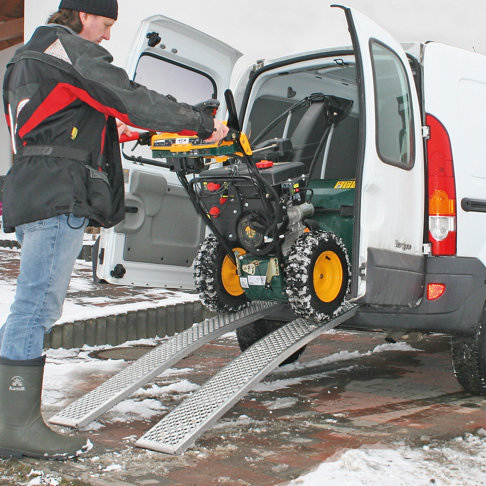 Aus hochfestem, witterungsbeständigem Aluminium. Mit Keilprofil am unteren Ende. Rampen inklusive Abrutschsicherung. Steigung max. 30%. Stabil und rutschfest durch gelochte Oberfläche.