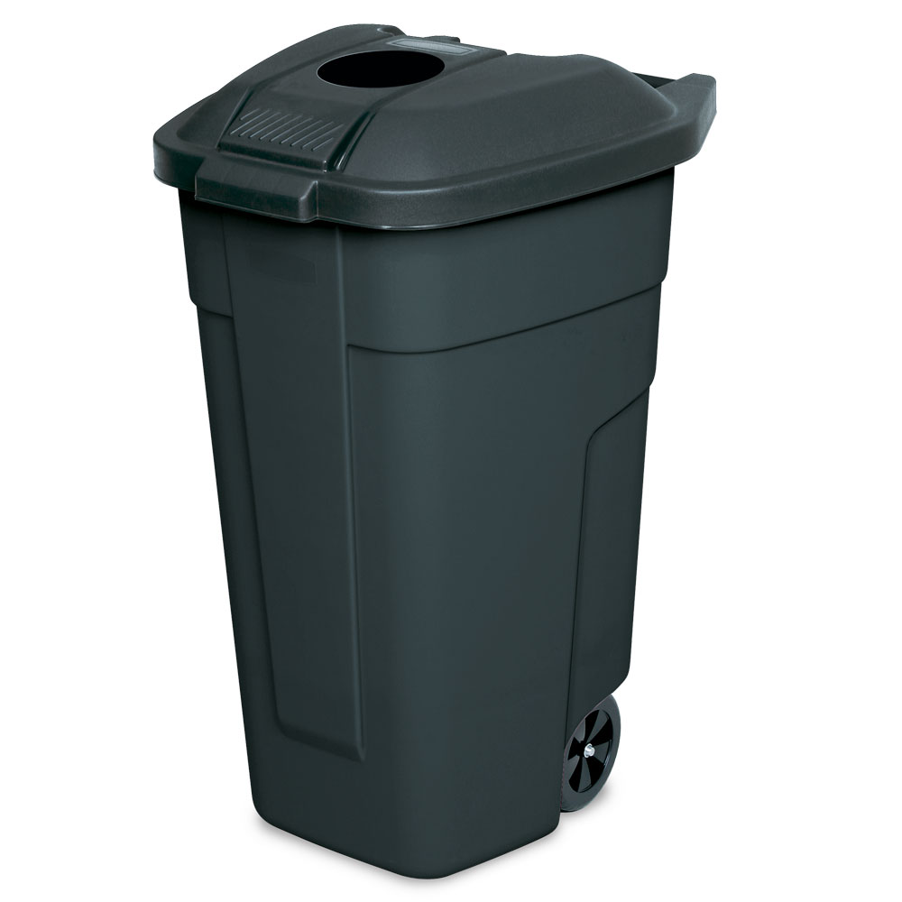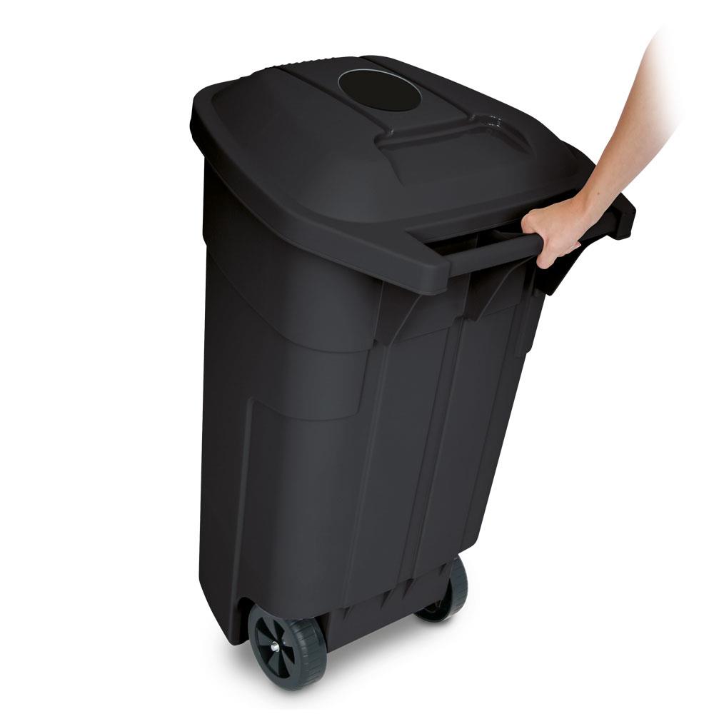 Fahrbarer Abfall-Behälter aus Polypropylen-Kunststoff (PP). Scharnierdeckel vollständig umklappbar für leichte Entleerung und mit einer Einwurföffnung Ø 120 mm versehen.