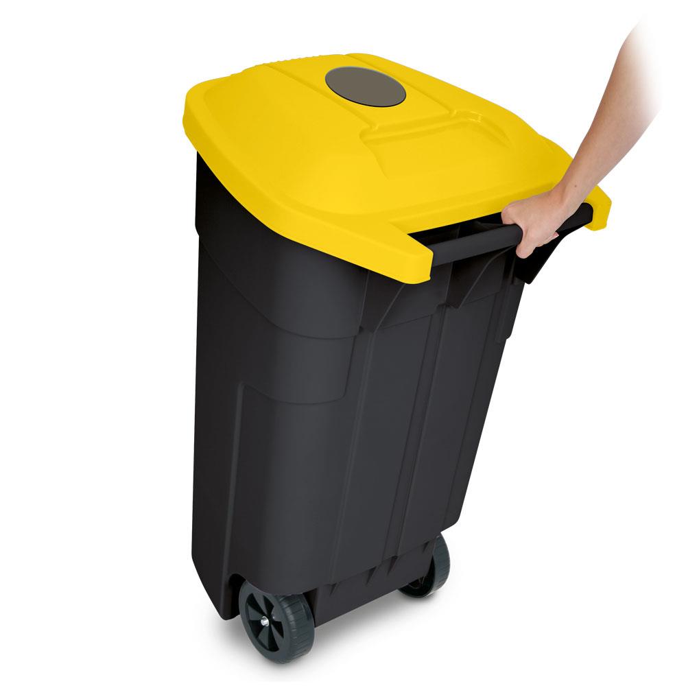 Fahrbarer Abfall-Behälter aus Polypropylen-Kunststoff (PP). Scharnierdeckel vollständig umklappbar für leichte Entleerung und mit einer Einwurföffnung Ø 120 mm versehen.