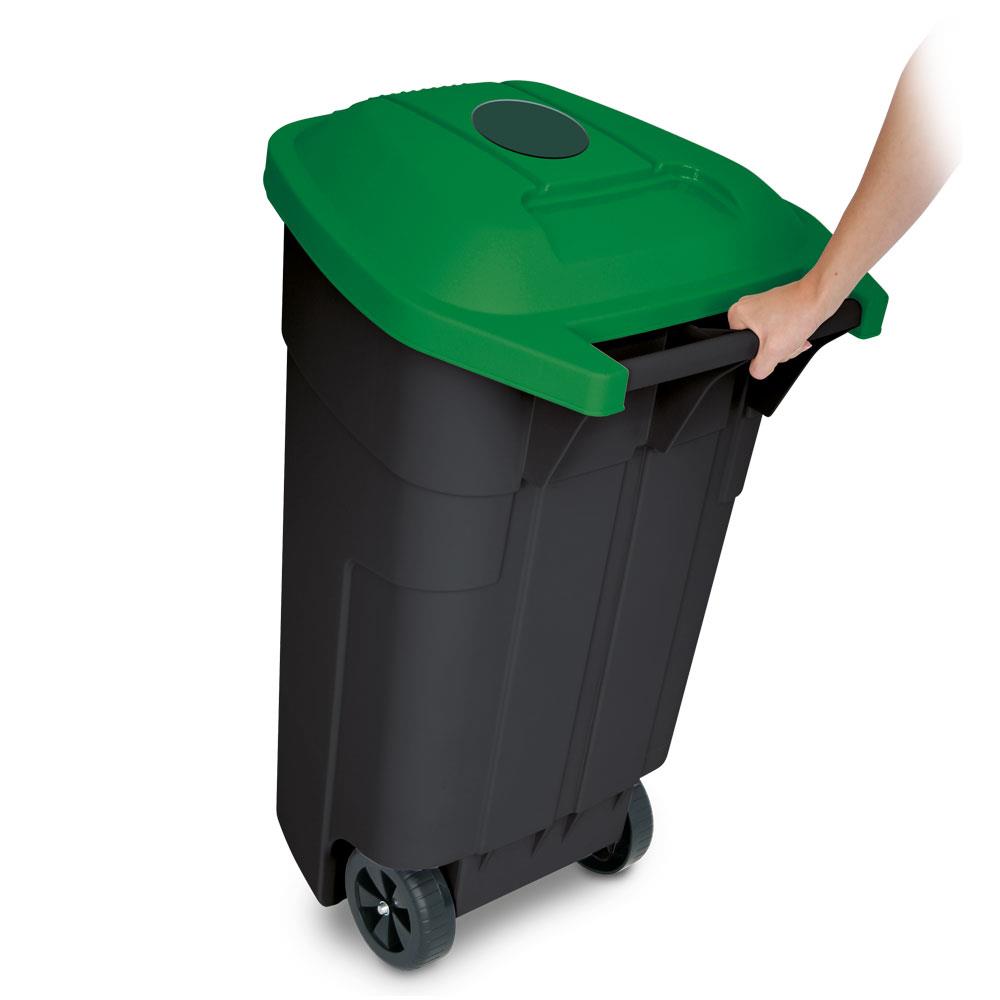 Fahrbarer Abfall-Behälter aus Polypropylen-Kunststoff (PP). Scharnierdeckel vollständig umklappbar für leichte Entleerung und mit einer Einwurföffnung Ø 120 mm versehen.