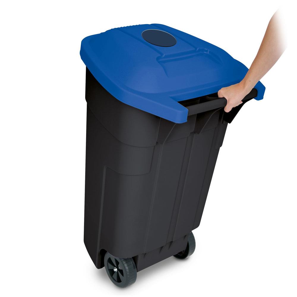 Fahrbarer Abfall-Behälter aus Polypropylen-Kunststoff (PP). Scharnierdeckel vollständig umklappbar für leichte Entleerung und mit einer Einwurföffnung Ø 120 mm versehen.