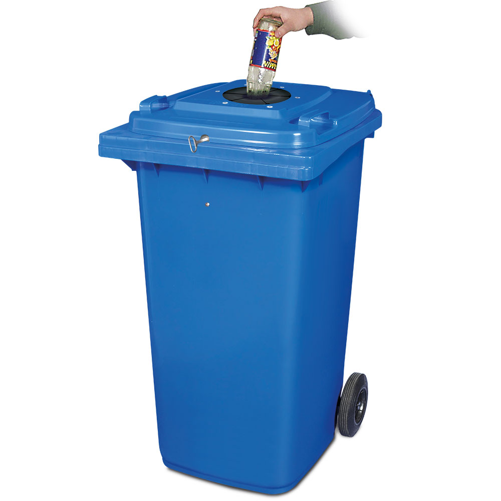 Verschließbarer Müllbehälter mit Flascheneinwurf und Gummirosette, 240 Liter, blau