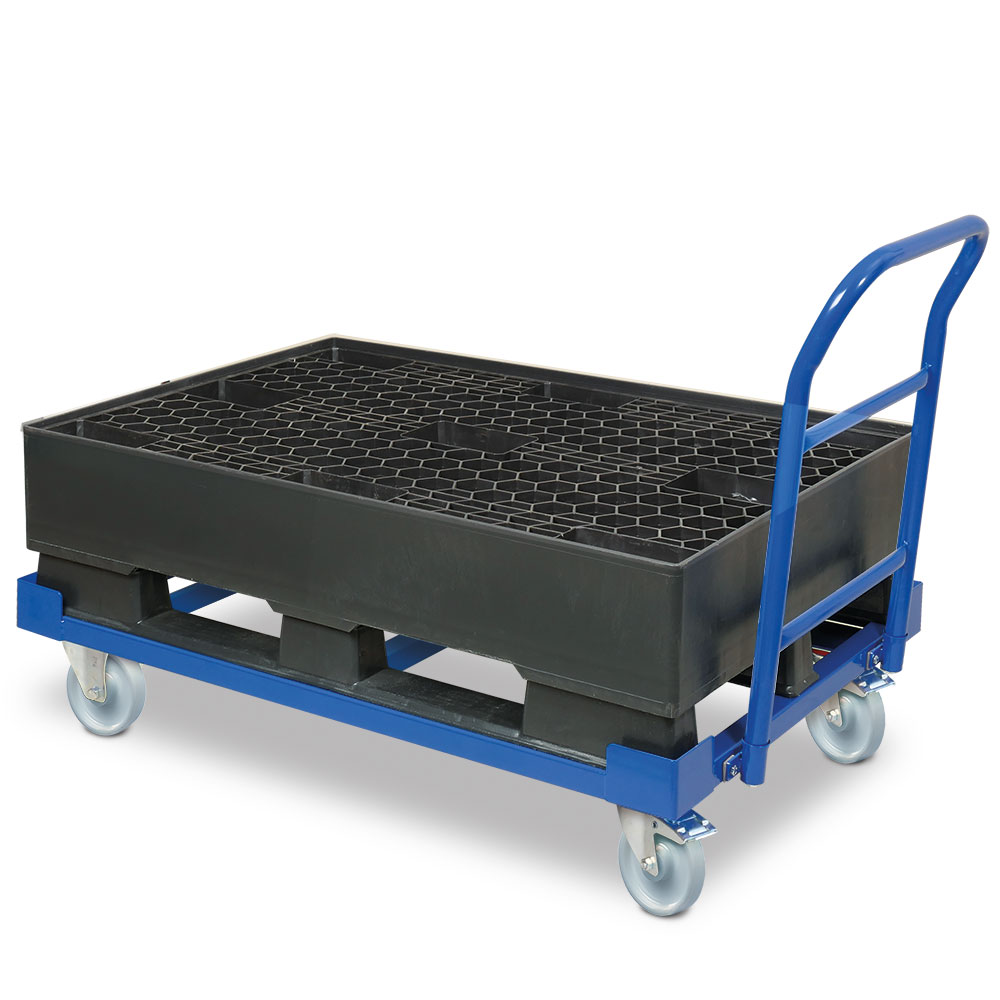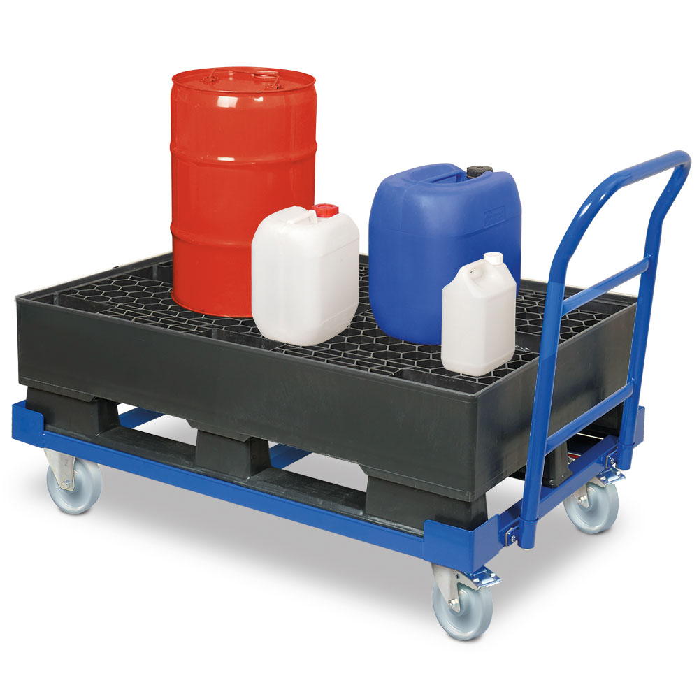 Fahrwagen mit aufgesetzter Auffangwanne aus Polyethylen (PE-RE) Kunststoff, BxTxH 1200x800x315 mm, OK Ladefläche 230/545 mm, Ausführung mit Kufen, mit Kunststoffgitter. Fahrwagen aus einer sehr robusten Schweißkonstruktion aus Profilstahl, kunststoffbeschichtet in blau RAL 5010. Mit Schiebebügel und 4 geschweißten Aufsetzhilfen. Leicht fahrbar auf 2 Lenk- und Bockrollen, kugelgelagert mit Polyamidrädern, Lenkrollen mit Feststellbremsen.