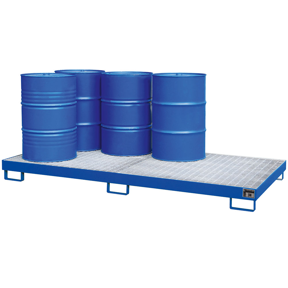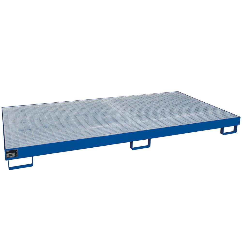 Auffangwanne aus Stahlblech, blau, für 8x 200 Liter-Fässer mit Gitterrost feuerverzinkt