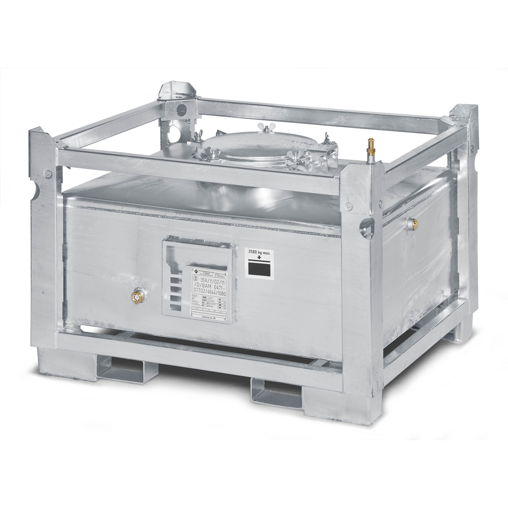 Doppelwandiger Gefahrgutbehälter für die Sammlung und zum Transport von Gefahrgut-Flüssigkeiten. Eisetzbar und erlaubt für den Transport ohne Einschränkung von Flammpunkt und Wassergefährdungsklasse (WGK). Der feuerverzinkte Gefahrgutbehälter ist stapelbar, kranbar und ermöglicht jederzeit eine Leckagekontrolle mittels Schauglas im Doppelmantel und Peilstab. Für passive Lagerung erlaubt. Bei aktiver Lagerung erlaubt ohne Einschränkung von Flammpunkt und Wassergefährdungsklasse. Aufgrund der doppelwandigen Ausführung für Lagerung ohne zusätzliche Auffangwanne zulässig.