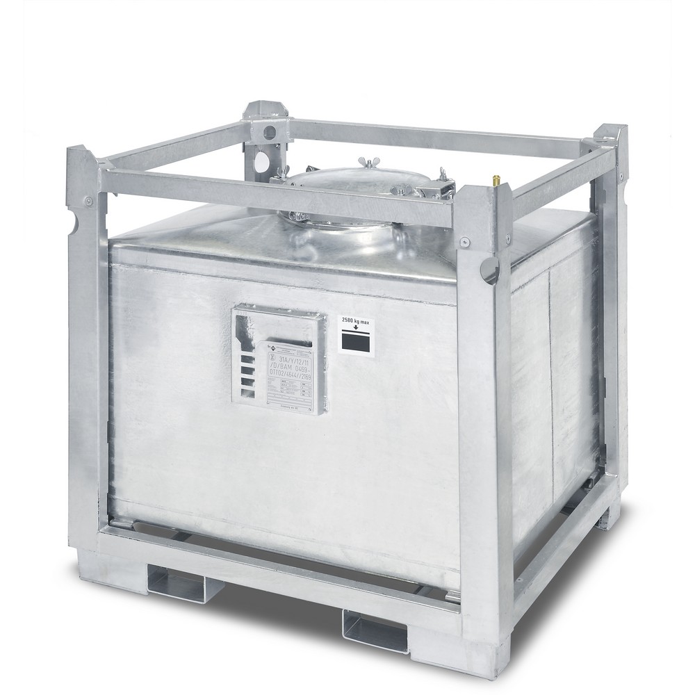 Gefahrgutbehälter aus feuerverzinktem Stahl für die Sammlung und zum Transport von Gefahrgut-Flüssigkeiten. Ohne Bodenauslauf. Feuerverzinkter Behälter in einwandiger Bauweise mit UN-Zulassung. Oberboden mit Mannloch NW 400 und abschließbarem Deckel. Für passive Lagerung erlaubt. Einsetzbar und erlaubt für den Transport ohne Einschränkung bei Flammpunkt und Wassergefährdungsklasse (WGK). Bei aktiver Lagerung erlaubt für Stoffe mit Flammpunkt >55°C bis einschließlich WGK 2, bei Stoffen der WGK 3 ist grundsätzlich eine zusätzliche Auffangwanne vorgeschrieben.